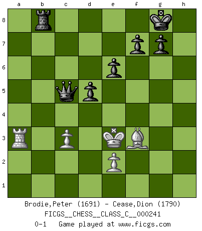 Last move : 0-1 2017 July 12 4:32:55 [Event "FICGS__CHESS__CLASS_C__000241"] [Site "FICGS"] [Date "2017.03.18"] [Round "1"] [White "Brodie,Peter"] [Black "Cease,Dion"] [Result "0-1"] [WhiteElo "1691"] [BlackElo "1790"] 1.Nf3 d5 2.d4 e6 3.Bf4 c5 4.Nc3 cxd4 5.Nxd4 a6 6.g3 Nf6 7.Bg2 Bb4 8.a3 Bxc3+ 9.bxc3 O-O 10.Be5 Nbd7 11.Bxf6 Nxf6 12.f4 Bd7 13.c4 Qc7 14.Rb1 Qxc4 15.Rxb7 Qc3+ 16.Qd2 Qa1+ 17.Kf2 Qxa3 18.Qb4 Ng4+ 19.Kf1 Qe3 20.Qe1 Qxd4 21.Rxd7 Rab8 22.c3 Qe3 23.Bf3 Rb1 24.Bxg4 Rxe1+ 25.Kxe1 Qc1+ 26.Kf2 Qxh1 27.Bf3 Qxh2+ 28.Bg2 Rb8 29.Ra7 h5 30.Rxa6 h4 31.gxh4 Qxf4+ 32.Bf3 Qxh4+ 33.Ke3 Qc4 34.Ra3 Qc5+ 0-1 Reti Opening Kingside Castling by player Black (move 9) Player Black won this chess game. Follow this game move after move (download)Who is your opponent tonight, tonight I am playing against the Black pieces. (Akiba Rubinstein) Jeder weiß, dass Gasprom Putins persönliches Machtinstrument ist. Die Firma wird vom Kreml aus geleitet und wird schon deshalb nie transparent sein. (Garry Kasparov) El Ajedrez es un juego de pelea el cual es puramente intelectual e incluye la suerte. (Richard Reti) Je menace de comprendre la position. (Anonyme) Secret operations are essential in war; upon them the army relies to make its every move. (Sun Tzu)