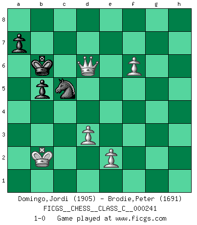 Last move : 1-0 2017 June 10 8:47:41 [Event "FICGS__CHESS__CLASS_C__000241"] [Site "FICGS"] [Date "2017.03.18"] [Round "1"] [White "Domingo,Jordi"] [Black "Brodie,Peter"] [Result "1-0"] [WhiteElo "1905"] [BlackElo "1691"] 1.g4 e5 2.c4 d5 3.Bg2 dxc4 4.Nc3 Nf6 5.g5 Nh5 6.Bd5 Nf4 7.Bxc4 Nc6 8.d3 h6 9.Bxf4 exf4 10.Nf3 hxg5 11.Qb3 Qe7 12.Nd5 Qd8 13.Nc3 Qe7 14.Nd5 Qd8 15.O-O-O Bd6 16.h3 O-O 17.Rhg1 g4 18.hxg4 Na5 19.Qc2 c6 20.Nc3 b5 21.Rh1 Re8 22.Ne4 Bxg4 23.Bxf7+ Kxf7 24.Nfg5+ Ke7 25.Rdg1 Bf5 26.Qc3 Rg8 27.Nxd6 Qxd6 28.Ne4 Qe6 29.Rxg7+ Rxg7 30.Qxg7+ Qf7 31.Qe5+ Qe6 32.Qc7+ Qd7 33.Qxf4 Rf8 34.Qg5+ Ke8 35.Nf6+ Rxf6 36.Qxf6 Qe7 37.Qxf5 Kd8 38.Rh8+ Kc7 39.Rh7 Qxh7 40.Qxh7+ Kb6 41.b4 Nb7 42.f4 c5 43.f5 cxb4 44.Qd7 Na5 45.f6 b3 46.axb3 Nxb3+ 47.Kb2 Nc5 48.Qd6+ 1-0 Grob's attack Queenside Castling by player White (move 15) Kingside Castling by player Black (move 16) 10 pieces endgame at move 46 : White KQPPPP , Black KNPP WHITE : King + 1 Queen 4 Pawns BLACK : King + 1 Knight 2 Pawns 9 pieces endgame at move 46 : White KQPPP , Black KNPP WHITE : King + 1 Queen 3 Pawns BLACK : King + 1 Knight 2 Pawns Player White won this chess game. Follow this game move after move (download)If your opponent offers you a draw, try to work out why he thinks he's worse off. (Nigel Short) Um sich vor der Gefahr einer Erkältung zu schützen, sorge der wanderlustige König beizeiten für ein brauchbares Versteck. (Aaron Nimzowitsch) Solo el jugador con la iniciativa tiene el derecho a atacar. (Wilhelm Steinitz) La menace est plus forte que l'exécution. (Aaron Nimzovitch) Establishing goals is all right if you don't let them deprive you of interesting detours. (Doug Larson)
