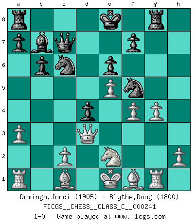 Last move : 1-0 2017 July 2 22:41:46 [Event "FICGS__CHESS__CLASS_C__000241"] [Site "FICGS"] [Date "2017.03.18"] [Round "1"] [White "Domingo,Jordi"] [Black "Blythe,Doug"] [Result "1-0"] [WhiteElo "1905"] [BlackElo "1800"] 1.e4 e6 2.d4 d5 3.Nc3 Bb4 4.e5 c5 5.a3 Bxc3+ 6.bxc3 Ne7 7.Qg4 Qc7 8.Qxg7 Rg8 9.Qxh7 cxd4 10.Ne2 dxc3 11.f4 Nbc6 12.Qd3 Nf5 13.Qxc3 d4 14.Qd3 b6 15.Rg1 Bb7 16.g4 1-0 This chess game has been lost on time (started : 2017.03.18 15:53:57) French : Winawer, Advance, poisoned pawn variation Player White won this chess game. Follow this game move after move (download)The enormous mental resilience, without which no Chess player can exist, was so much taken up by Chess that he could never free his mind of this game. (Albert Einstein) Dieses schreckliche Gefühl, dass ich gegen eine Maschine spielte, die niemals Fehler macht, zerschmetterte meinen Widerstand. (Mark Taimanov) No hay otro maestro que tenga una voluntad terrífica de ganar. Al tablero, el irradía peligro y aún los oponentes mas fuertes tienden a congelarse como liebres cuando olfatean a una pantera. Aún sus debilidades son peligrosas. Con las blancas, su juego de apertura es predecible - te es posible hacer planes en su contra - pero es tan fuerte que tus planes casi nunca funcionan. En el juego medio, su precisión e invención son fabulosas y en finales, tú simplemente no le puedes vencer. (Experto Alemán anónimo) Votre seul travail dans les ouvertures est d'obtenir un milieu de partie jouable. (Lajos Portish) It's not the will to win, but the will to prepare to win that makes the difference. (Bear Bryant)