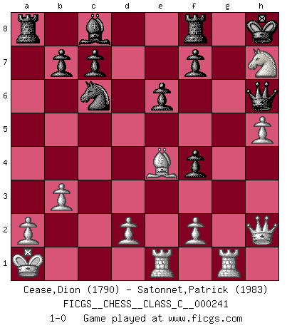 Last move : 1-0 2017 October 24 10:51:59 [Event "FICGS__CHESS__CLASS_C__000241"] [Site "FICGS"] [Date "2017.03.18"] [Round "1"] [White "Cease,Dion"] [Black "Satonnet,Patrick"] [Result "1-0"] [WhiteElo "1790"] [BlackElo "1983"] 1.e4 e6 2.b3 d5 3.Bb2 dxe4 4.Nc3 Nf6 5.Qe2 Bb4 6.O-O-O Qe7 7.Kb1 Ba3 8.Ba1 a5 9.g4 O-O 10.g5 Nd5 11.Qxe4 Qxg5 12.Nh3 Qh5 13.Re1 Nf6 14.Qe3 Bc5 15.Qg3 Bd4 16.Rg1 Ne8 17.Bd3 g6 18.Nf4 Qh6 19.h4 Nc6 20.h5 Ng7 21.Ne4 Nf5 22.Qh2 Bxa1 23.Kxa1 a4 24.Nf6+ Kh8 25.Bxf5 g5 26.Nxh7 axb3 27.cxb3 gxf4 28.Be4 1-0 French : Reti (Spielmann) variation Queenside Castling by player White (move 6) Kingside Castling by player Black (move 9) Player White won this chess game. Follow this game move after move (download)Chess is a terrible game. If you have no center, your opponent has a freer position. If you do have a center, then you really have something to worry about ! (Siegbert Tarrasch) Alle offensichtlichen Züge sehen nach dem Spiel in der Analyse verdächtig aus. (Viktor Kortschnoi) En posiciones complicadas, Bobby Fischer pocas veces tuvo que temer de cualquiera. (Paul Keres) D'abord les bases : Jouez et étudiez, puis étudiez et jouez, ensuite jouez et étudiez, puis étudiez et jouez. Deuxièmement : Donnez toujours le meilleur de vous-même ! (Ken Smith) After growing wildly for years, the field of computing appears to be reaching its infancy. (John Pierce)