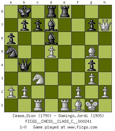 Last move : 1-0 2017 November 4 9:53:43 [Event "FICGS__CHESS__CLASS_C__000241"] [Site "FICGS"] [Date "2017.03.18"] [Round "1"] [White "Cease,Dion"] [Black "Domingo,Jordi"] [Result "1-0"] [WhiteElo "1790"] [BlackElo "1905"] 1.e4 e5 2.Nf3 Nc6 3.Bc4 f5 4.d4 exd4 5.e5 d5 6.exd6 Qxd6 7.O-O Be7 8.Re1 Nf6 9.c3 Bd7 10.cxd4 O-O-O 11.Nc3 a6 12.d5 Na5 13.Bf1 Rhe8 14.Ne5 Ng4 15.Nxg4 fxg4 16.Be3 Bf6 17.Rc1 Be5 18.g3 Qb4 19.Qc2 Bd6 20.Qxh7 Kb8 21.Bg5 1-0 Rousseau gambit Kingside Castling by player White (move 7) Queenside Castling by player Black (move 10) Player White won this chess game. Follow this game move after move (download)The blunders are all there on the board, waiting to be made. (Savielly Tartakover) Ich hatte Zahnschmerzen im ersten Spiel. In der zweiten Partie tat mir der Kopf weh. In der dritten war es eine Rheuma-Attacke und während der vierten fühlte ich mich nicht gut. Und in der fünften? Nun, man muss doch nicht jedes Spiel gewinnen, oder? (Savielly Grigorievitsch Tartakower) El ganador de una partida es aquel jugador que hace el penúltimo error. (Savielly Tartakover) Le génie consiste à savoir transgresser les règles au moment opportun. (Teichmann) Man with more than one clock never knows what time it is. (Chinese thought)