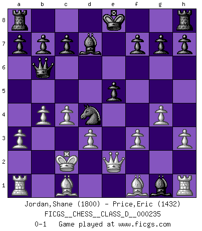 Last move : 0-1 2017 March 22 2:17:55 [Event "FICGS__CHESS__CLASS_D__000235"] [Site "FICGS"] [Date "2017.03.19"] [Round "1"] [White "Jordan,Shane"] [Black "Price,Eric"] [Result "0-1"] [WhiteElo "1800"] [BlackElo "1432"] 1.h3 e5 2.e4 Nf6 3.Nc3 Bb4 4.f3 d5 5.a3 Bc5 6.exd5 Nxd5 7.Nxd5 Qh4+ 8.Ke2 Qf2+ 9.Kd3 Bf5+ 10.Kc3 Qd4+ 11.Kb3 Qxd5+ 12.c4 Qc6 13.d3 Qb6+ 14.Kc2 Bxg1 15.g4 Bd7 16.Qe2 Nc6 17.b4 Nd4+ 0-1 Comment by player 1 : Shane Jordan : I'm afraid I'm not providing much of a challenge. Clemenz (Mead's, Basman's or de Klerk's) Opening Player Black won this chess game. Follow this game move after move (download)A good player is always lucky. (Jose Raul Capablanca) Der 70jährige Viktor Kortschnoi: Die Rentenanstalt wollte mich zwingen in Rente zu gehen. Meine Frau erhält jetzt eine Pension- und ich zahle weiter in die Rentenkasse ein! (Viktor Kortschnoi) Tu sabes que vas a perder. Aún cuando tenía la ventaja, yo sabía que iba a perder. - al estar jugando con Fischer (Andrew Soltis) Toute estimation doit être constamment réévaluée. (Jacob Estrin) You think that education is too expensive ? Try ignorance. (Derek Bok)