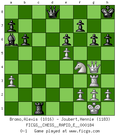 Last move : 0-1 2017 May 2 14:17:14 [Event "FICGS__CHESS__RAPID_E__000184"] [Site "FICGS"] [Date "2017.03.23"] [Round "1"] [White "Bromo,Alexis"] [Black "Joubert,Hennie"] [Result "0-1"] [WhiteElo "1016"] [BlackElo "1183"] 1.d4 Nf6 2.c4 e6 3.a3 b6 4.Nc3 Bb7 5.e3 Be7 6.Nf3 O-O 7.Be2 d5 8.b3 c5 9.Bb2 cxd4 10.exd4 dxc4 11.Bxc4 Nc6 12.Ne2 Rc8 13.Ng3 Na5 14.Rc1 Nxc4 15.bxc4 h6 16.O-O Ba6 17.Ne5 Bd6 18.Re1 Bxe5 19.dxe5 Nd7 20.Qg4 Nc5 21.Red1 Qe7 22.Nh5 g6 23.Nf6+ Kg7 24.Bd4 Nb3 25.Rc3 Nxd4 26.Rxd4 Rfd8 27.Rxd8 Qxd8 28.Nh5+ Kh8 29.Rg3 Rxc4 30.Nf4 Rc1+ 0-1 Queen's pawn game Kingside Castling by player Black (move 6) Kingside Castling by player White (move 16) Player Black won this chess game. Follow this game move after move (download)Chess is a matter of delicate judgment, knowing when to punch and how to duck. (Bobby Fischer) Nie in meinem Leben habe ich die französische Verteidigung gespielt, welche die Stumpfsinnigste von allen ist. (Wilhelm Steinitz) Evita las multitudes. Haz independientemente tu propio razonamiento. Trata de ser el jugador de Ajedrez, no la pieza de Ajedrez. (Ralph Charell) Le jeu d'échecs fait naître et fortifie en nous plusieurs qualités précieuses dans le cours de l'existence, telles que la prévoyance, la circonspection, la prudence, et la persévérance. (Benjamin Franklin - 1783, la morale des échecs) Excelling at chess has long been considered a symbol of more general intelligence. That is an incorrect assumption in my view, as pleasant as it might be. But for the purposes of argument and investigation, chess is, in Russkin-Gutman's words, 'an unparalleled laboratory, since both the learning process and the degree of ability obtained can be objectified and quantified, providing an excellent comparative framework on which to use rigorous analytical techniques.' (The Chess Master and the Computer, by Garry Kasparov - 2010)
