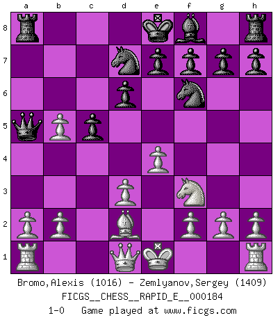 Last move : 1-0 2017 May 17 16:23:56 [Event "FICGS__CHESS__RAPID_E__000184"] [Site "FICGS"] [Date "2017.03.23"] [Round "1"] [White "Bromo,Alexis"] [Black "Zemlyanov,Sergey"] [Result "1-0"] [WhiteElo "1016"] [BlackElo "1409"] 1.e4 c5 2.Nf3 d6 3.Bb5+ Nd7 4.Nc3 a6 5.Ba4 b5 6.Bxb5 axb5 7.Nxb5 Ngf6 8.d3 Ba6 9.c4 Bxb5 10.cxb5 Qa5+ 11.Bd2 1-0 This chess game has been lost on time (started : 2017.03.23 21:37:21) Sicilian : Canal-Sokolsky (Nimzovich-Rossolimo, Moscow) attack Player White won this chess game. Follow this game move after move (download)Live, lose, and learn, by observing your opponent how to win. (Amber Steenbock) Die meiste Zeit treffe ich auf Gegner, die meine Enkel sein könnten. Ich bin da, um ihnen zu zeigen, dass sie von mir noch einiges lernen können. (Viktor Kortschnoi) Los libros de Ajedrez deben de usarse igual como usamos los anteojos: para mejorar la vista, aunque algunos jugadores los quieren usar como si ellos les otorgaran la vision. (José Raúl Capablanca) A ce moment-là, je menaçais de comprendre la position ! (Clément L'Heureux) Programming can only do so much before it becomes too much. (Don Groves)