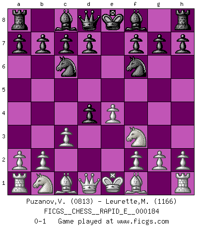 Last move : 0-1 2017 April 27 19:17:51 [Event "FICGS__CHESS__RAPID_E__000184"] [Site "FICGS"] [Date "2017.03.23"] [Round "1"] [White "Puzanov,Vasyl"] [Black "Leurette,Marc-Antoine"] [Result "0-1"] [WhiteElo "0813"] [BlackElo "1166"] 1.e4 e5 2.Nf3 Nc6 3.c3 Nf6 4.d4 exd4 0-1 Ponziani : Jaenisch counter-attack Player Black won this chess game. Follow this game move after move (download)I'm not afraid of Spassky. The world knows I'm the best. You don't need a match to prove it. (Bobby Fischer) Fischer: 'Remis!?' Uhlmann: 'Aber es muss doch dreimal Zugwiederholung sein!' Fischer: 'Sie nehmen das Remis an, wie ich es sage, sonst spiele ich weiter und werde Sie dann schlagen!' (Robert James Fischer) Jugadores de primera clase pierden en contra de jugadores de segunda clase porque los jugadores de segunda clase a veces juegan una partida de primer clase. (Siegbert Tarrasch) La vie et les Echecs sont tous les deux une lutte constante. (Lasker) Beep ! (R2D2 in Star Wars ep.3)