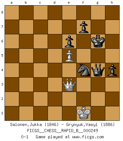 Last move : 0-1 2017 May 18 7:47:34 [Event "FICGS__CHESS__RAPID_B__000249"] [Site "FICGS"] [Date "2017.03.24"] [Round "1"] [White "Salonen,Jukka"] [Black "Grynyuk,Vasyl"] [Result "0-1"] [WhiteElo "1846"] [BlackElo "1886"] 1.d4 d5 2.c4 c6 3.Nf3 Nf6 4.Nc3 e6 5.e3 Nbd7 6.Bd3 dxc4 7.Bxc4 b5 8.Bd3 Bb7 9.e4 b4 10.Na4 c5 11.e5 Nd5 12.O-O cxd4 13.Re1 g6 14.Bg5 Qa5 15.Nxd4 a6 16.a3 bxa3 17.bxa3 Bg7 18.Bd2 Qd8 19.f4 Qb8 20.Qe2 O-O 21.Qf2 Rc8 22.Reb1 Bf8 23.Nb3 Bc6 24.Nd4 Bb5 25.Nxb5 axb5 26.Bxb5 Nc5 27.Bc6 Qc7 28.Nxc5 Qxc6 29.Ne4 Qc2 30.Re1 Bxa3 31.h4 Ra4 32.Kh2 Rxe4 33.Rxe4 Qxe4 34.Rxa3 h5 35.Qf3 Qd4 36.Rd3 Qb2 37.Qg3 Ne7 38.Qe3 Nf5 39.Rb3 Qa2 40.Ra3 Qb1 41.Qb3 Qf1 42.Qf3 Qb5 43.Ra8 Rxa8 44.Qxa8+ Kg7 45.Be1 Qf1 46.Qe4 Nh6 47.Kg3 Ng4 48.Bb4 Qf2+ 49.Kh3 Kh7 50.Ba5 Qg1 51.Kg3 Ne3 52.Kf3 Nxg2 53.Ke2 Nxh4 54.Be1 Qg4+ 55.Kf2 Kg7 56.Ba5 g5 57.Bd2 Ng6 58.Bb4 Nxf4 59.Bd2 Qh4+ 60.Kf1 Qh3+ 61.Ke1 Qg3+ 62.Kf1 h4 63.Be1 Qg4 64.Bxh4 gxh4 65.Qe3 Kg6 0-1 QGD Slav : 4.Nc3 Kingside Castling by player White (move 12) Kingside Castling by player Black (move 20) 10 pieces endgame at move 64 : White KQBP , Black KQNPPP WHITE : King + 1 Queen 1 Bishop 1 Pawn BLACK : King + 1 Queen 1 Knight 3 Pawns 9 pieces endgame at move 64 : White KQP , Black KQNPPP WHITE : King + 1 Queen 1 Pawn BLACK : King + 1 Queen 1 Knight 3 Pawns Player Black won this chess game. Follow this game move after move (download)The passed Pawn is a criminal, who should be kept under lock and key. Mild measures, such as police surveillance, are not sufficient. (Aaron Nimzovich) Kleine Schachspieler machen Mist, und große Schachspieler machen Mist, aber große machen weniger Mist. (Fritz Sämisch) Nada excita más a Grandes Maestros aburridos que una novedad teórica. (Dominic Lawson) Le joueur d'Echecs qui veut atteindre le top est obligé de développer son propre credo créatif. Alexeï Stepanovicth Souétine. Il est facile d'écrire des livres ! Ce qui est difficile, c'est de jouer ! (Alexeï Stepanovicth Souétine) Whoever said the pen is mightier than the sword obviously never encountered automatic weapons. (US General Douglas MacArthur)