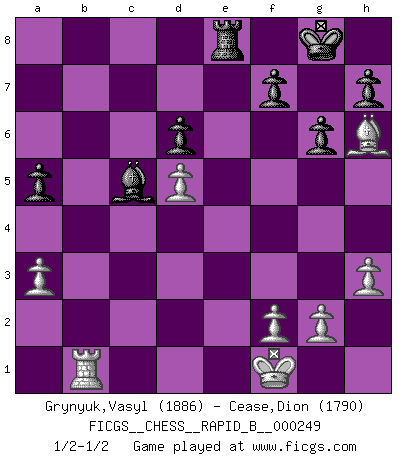 Last move : 1/2-1/2 2017 June 15 11:6:5 [Event "FICGS__CHESS__RAPID_B__000249"] [Site "FICGS"] [Date "2017.03.24"] [Round "1"] [White "Grynyuk,Vasyl"] [Black "Cease,Dion"] [Result "1/2-1/2"] [WhiteElo "1886"] [BlackElo "1790"] 1.e4 e5 2.Nf3 Nc6 3.Bb5 Nf6 4.O-O Nxe4 5.d4 Be7 6.Qe2 Nd6 7.Bxc6 bxc6 8.dxe5 Nf5 9.Qe4 g6 10.Nd4 Nxd4 11.Qxd4 O-O 12.Bh6 Re8 13.Nc3 d5 14.exd6 Bf6 15.Qc4 cxd6 16.Qxc6 Rb8 17.Nd5 Bxb2 18.Rab1 Bb7 19.Qa4 Be5 20.Ne3 a5 21.h3 Qc7 22.Rfd1 Bc6 23.Qh4 Re6 24.Rxb8+ Qxb8 25.Qc4 Qb7 26.Qd3 Qb4 27.a3 Qc5 28.Nd5 Re8 29.c4 Bxd5 30.cxd5 Qc3 31.Qxc3 Bxc3 32.Rb1 Bd4 33.Kf1 Bc5 1/2-1/2 Ruy Lopez : Open Berlin defense, 5...Be7 Kingside Castling by player White (move 4) Kingside Castling by player Black (move 11) This chess game ended in a draw. Follow this game move after move (download)A strong memory, concentration, imagination, and a strong will is required to become a great Chess player. (Bobby Fischer) Früher wurde jeder komplizierte Zug, jedes interessante Opfer mit großem Beifall und Enthusiasmus aufgenommen. Heute schaltet man einfach seinen Fritz an, und man kann sehen, was los ist, ob der Zug geht oder nicht. (Vladimir Kramnik) Bobby es el jugador de Ajedrez mas fino que este país jamás haya producido. Su memoria para las movidas, su brillantez en soñar combinaciones y su feróz determinación por la victoria son algo extraño. (John Collins) Mais n'est-ce pas déjà le limiter injurieusement que d'appeler les échecs un jeu? N'est-ce pas aussi une science, un art, ou quelque chose qui, comme le cercueil de Mahomet entre ciel et terre, est suspendu entre l'un et l'autre, et qui réunit un nombre incroyable de contraires ? (Stefan Zweig) The bottom line is always the bottom line. (Johann Piek)