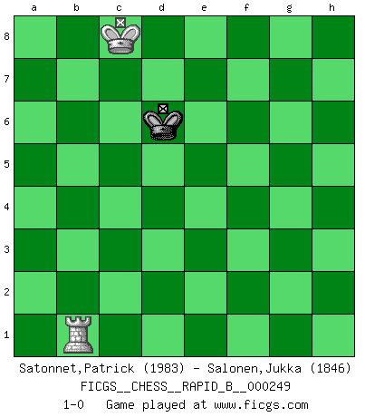 Last move : 1-0 2017 July 30 9:26:35 [Event "FICGS__CHESS__RAPID_B__000249"] [Site "FICGS"] [Date "2017.03.24"] [Round "1"] [White "Satonnet,Patrick"] [Black "Salonen,Jukka"] [Result "1-0"] [WhiteElo "1983"] [BlackElo "1846"] 1.e4 e5 2.Nf3 Nc6 3.Bb5 a6 4.Bxc6 dxc6 5.O-O f6 6.d4 exd4 7.Nxd4 c5 8.Ne2 Qxd1 9.Rxd1 Be6 10.Nbc3 Bd6 11.Bf4 O-O-O 12.a4 Bf7 13.f3 Ne7 14.h4 Be5 15.Kf2 Nc6 16.Bxe5 fxe5 17.Nd5 Bxd5 18.exd5 Nb4 19.c4 Rhf8 20.Nc3 Rf4 21.Ne4 Rxh4 22.b3 b6 23.a5 Rh6 24.Rd2 Rf8 25.Rad1 Re8 26.Re1 Kd7 27.axb6 cxb6 28.Kg1 Rf8 29.Re3 Rh5 30.g4 Rh6 31.Rde2 Rg6 32.Kh2 Rf4 33.Kg3 h5 34.g5 h4+ 35.Kh3 a5 36.Rg2 Ke7 37.Rc3 b5 38.Rd2 Rd6 39.Nxc5 Rd4 40.Re2 Rb6 41.Rxe5+ Kd6 42.Re8 bxc4 43.Ne4+ Kd7 44.Rg8 Nxd5 45.Rxg7+ Ke6 46.Rxc4 Rxc4 47.bxc4 Ne7 48.Kg4 Rb1 49.Nc5+ Kd6 50.Rf7 Ra1 51.Ne4+ Ke6 52.Rf6+ Ke5 53.Kxh4 Nf5+ 54.Kh5 Rg1 55.Nd6 Nxd6 56.f4+ Ke4 57.Rxd6 a4 58.Kh6 a3 59.Ra6 Ra1 60.c5 Kxf4 61.c6 Rh1+ 62.Kg7 Kxg5 63.Rxa3 Rc1 64.Ra6 Rc5 65.Rb6 Kf5 66.Kf7 Ke5 67.Ke7 Kd4 68.Kd7 Rd5+ 69.Kc7 Kc5 70.Rb1 Rg5 71.Kb7 Rg8 72.c7 Kd6 73.c8Q Rxc8 74.Kxc8 1-0 Ruy Lopez : Exchange, Gligoric variation Kingside Castling by player White (move 5) Queenside Castling by player Black (move 11) 10 pieces endgame at move 53 : White KRNPPP , Black KRNP WHITE : King + 1 Rook 1 Knight 3 Pawns BLACK : King + 1 Rook 1 Knight 1 Pawn 9 pieces endgame at move 55 : White KRPPP , Black KRNP WHITE : King + 1 Rook 3 Pawns BLACK : King + 1 Rook 1 Knight 1 Pawn 8 pieces endgame at move 57 : White KRPPP , Black KRP WHITE : King + 1 Rook 3 Pawns BLACK : King + 1 Rook 1 Pawn 7 pieces endgame at move 60 : White KRPP , Black KRP WHITE : King + 1 Rook 2 Pawns BLACK : King + 1 Rook 1 Pawn 6 pieces endgame at move 62 : White KRP , Black KRP WHITE : King + 1 Rook 1 Pawn BLACK : King + 1 Rook 1 Pawn 5 pieces endgame at move 63 : White KRP , Black KR WHITE : King + 1 Rook 1 Pawn BLACK : King + 1 Rook Promotion Queen by player White (move 73) 4 pieces endgame at move 73 : White KR , Black KR WHITE : King + 1 Rook BLACK : King + 1 Rook 3 pieces endgame at move 74 : White KR , Black K WHITE : King + 1 Rook BLACK : King + Player White won this chess game. Follow this game move after move (download)In life, as in Chess, one's own Pawns block one's way. A man's very wealth, ease, leisure, children, books, which should help him to win, more often checkmate him. (Charles Buxton) Das Schachspiel hat wie die Liebe, die Musik, die Fähigkeit, den Menschen glücklich zu machen. Ich habe ein leises Gefühl des Bedauerns für jeden, der das Schachspiel nicht kennt, so wie ich jeden bedaure, der die Liebe nicht kennt. (Siegbert Tarrasch) Al jugar al Ajedrez entonces, podemos aprender: Primero: Previsión... Segundo: Prudencia... Tercero: Cautela... Y al final, aprendemos del Ajedrez el hábito de no ser desanimados por apariencias malas presentes en el estado de nuestros asuntos, el hábito de la esperanza por una oportunidad favorable y la perseveración de los secretos de los recursos. (Benjamin Franklin) Les échecs sont utiles à l'exercice de la faculté de penser et à celle de l'imagination. Car nous devons posséder une méthode élaborée pour atteindre des buts partout où nous devons conduire notre raison. (Leibnitz) Once you start thinking you have nothing left to learn, you have everything to learn. (Steve Badget)