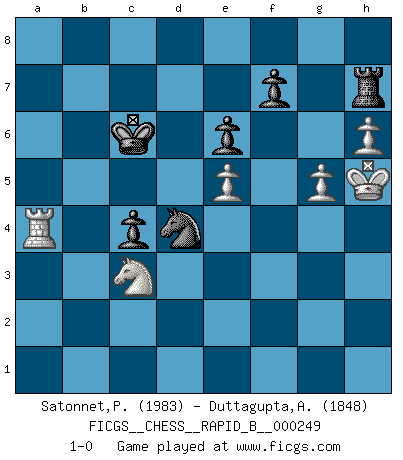 Last move : 1-0 2017 September 15 19:39:28 [Event "FICGS__CHESS__RAPID_B__000249"] [Site "FICGS"] [Date "2017.03.24"] [Round "1"] [White "Satonnet,Patrick"] [Black "Duttagupta,Aniruddha"] [Result "1-0"] [WhiteElo "1983"] [BlackElo "1848"] 1.e4 e6 2.d3 d5 3.Nd2 Nf6 4.Ngf3 c5 5.g3 Nc6 6.Bg2 Be7 7.O-O b6 8.Re1 Bb7 9.e5 Nd7 10.Nf1 Qc7 11.c3 O-O-O 12.d4 h6 13.a4 g5 14.Ne3 Kb8 15.Nc2 Rdg8 16.b4 cxb4 17.Nxb4 g4 18.Nxc6+ Qxc6 19.Nd2 Qxc3 20.Nb3 Rc8 21.Ra2 h5 22.a5 Qc7 23.axb6 Nxb6 24.Ba3 Bxa3 25.Rxa3 Qc2 26.Qa1 Qc3 27.Nc5 Qxa1 28.Rexa1 Nc4 29.Rb3 Nb6 30.h4 Rc7 31.f3 Rg8 32.Kh2 Bc8 33.Rb4 Re8 34.fxg4 hxg4 35.Rb2 Rf8 36.Rf1 Ka8 37.Rbf2 Nc4 38.Rc1 Na5 39.Bf1 Rg8 40.Be2 Nb7 41.Nd3 Rxc1 42.Nxc1 Nd8 43.Rf4 Kb7 44.Rxg4 Rh8 45.Rf4 Kb6 46.h5 Ba6 47.g4 Bc4 48.Bxc4 dxc4 49.Ne2 Rh7 50.Kg3 Nc6 51.Kh4 Ne7 52.Rf1 Nd5 53.g5 a5 54.h6 Kb5 55.Rb1+ Kc6 56.Kh5 Ne7 57.Nc3 Nf5 58.Rb8 Ne7 59.Rb5 Nf5 60.Rxa5 Nxd4 61.Ra4 1-0 French : King's Indian attack Kingside Castling by player White (move 7) Queenside Castling by player Black (move 11) Player White won this chess game. Follow this game move after move (download)Via the squares on the chessboard, the Indians explain the movement of time and the age, the higher influences which control the world and the ties which link Chess with the human soul. (Al-Masudi) Der zweitbeste Zug ist oft der einzig richtige. (Savielly Grigorievitsch Tartakower) El Ajedrez moderno está demasiado preocupado con cosas como la estructura de Peones. Olvidenlo, el Jaque Mate termina la partida. (Nigel Short) Seul un grand joueur sait à quel point il joue faiblement. (Xavier Tartacover) Two beer, or not two beer. (Unknown)