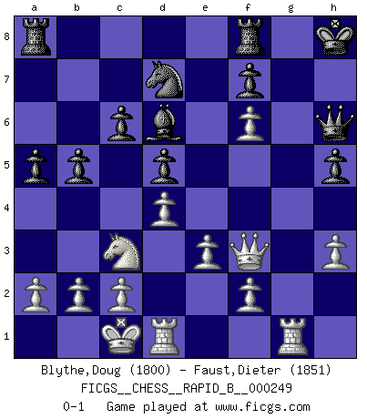 Last move : 0-1 2017 June 17 21:13:29 [Event "FICGS__CHESS__RAPID_B__000249"] [Site "FICGS"] [Date "2017.03.24"] [Round "1"] [White "Blythe,Doug"] [Black "Faust,Dieter"] [Result "0-1"] [WhiteElo "1800"] [BlackElo "1851"] 1.d4 Nf6 2.Bg5 d5 3.e3 g6 4.Bxf6 exf6 5.Nc3 c6 6.Qf3 Bd6 7.Bd3 O-O 8.Nge2 h5 9.h3 f5 10.O-O-O a5 11.Nf4 b5 12.Nxh5 gxh5 13.Bxf5 Qf6 14.g4 Bxf5 15.gxf5 Qh6 16.Rhg1+ Kh8 17.f6 Nd7 0-1 This chess game has been lost on time (started : 2017.03.24 15:57:19) Trompowsky attack (Ruth, Opovcensky Opening) Kingside Castling by player Black (move 7) Queenside Castling by player White (move 10) Player Black won this chess game. Follow this game move after move (download)One doesn't have to play well, it's enough to play better than your opponent. (Siegbert Tarrasch) Ich verlor meine Bürgerrechte, mein Gehalt wurde mir nicht mehr bezahlt und ich wurde zensiert und durfte nicht mehr ins Ausland reisen. [nach dem Match Fischer-Taimanov 6:0] (Mark Taimanov) El Ajedrez es un juego terrible. Si no dominas el centro, tu oponente tiene una posición mas libre. Si tu tienes el centro, entonces realmente tienes algo de que preocuparte. (Siegbert Tarrasch) Celui qui prend des risques peut perdre, celui qui n'en prend pas perd toujours. (Xavier Tartacover) Unless I accept my faults I will most certainly doubt my virtues. (Hugh Prather)