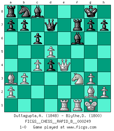 Last move : 1-0 2017 May 13 19:36:4 [Event "FICGS__CHESS__RAPID_B__000249"] [Site "FICGS"] [Date "2017.03.24"] [Round "1"] [White "Duttagupta,Aniruddha"] [Black "Blythe,Doug"] [Result "1-0"] [WhiteElo "1848"] [BlackElo "1800"] 1.d4 e6 2.c4 f5 3.g3 Nf6 4.Bg2 Be7 5.Nf3 O-O 6.O-O d6 7.Nc3 Qe8 8.b3 Ne4 9.Nxe4 fxe4 10.Nd2 d5 11.f3 exf3 12.Nxf3 c6 13.Qc2 Bf6 14.e4 e5 15.Ba3 Rf7 16.exd5 exd4 17.Rae1 Qd7 18.Qe4 1-0 Queen's pawn Kingside Castling by player Black (move 5) Kingside Castling by player White (move 6) Player White won this chess game. Follow this game move after move (download)Chess books should be used as we use glasses: to assist the sight, although some players make use of them as if they thought they conferred sight. (Jose Raul Capablanca) Wie bekannt hörte Morphy 1859 auf, Schach zu spielen. Seine Enttäuschung galt nicht so sehr dem Schach, wie den Schachspielern. (Robert James Fischer) ¿Porque tengo que perder ante este idiota?. (Aron Nimzovich) Les échecs sont plus proches de l'art de l'assassinat que de l'art de la guerre. (Arturo Perez-Reverte) Just because you do not take an interest in politics doesn't mean politics won't take an interest in you. (Pericles 430 B.C.)