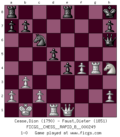 Last move : 1-0 2017 July 8 16:21:33 [Event "FICGS__CHESS__RAPID_B__000249"] [Site "FICGS"] [Date "2017.03.24"] [Round "1"] [White "Cease,Dion"] [Black "Faust,Dieter"] [Result "1-0"] [WhiteElo "1790"] [BlackElo "1851"] 1.e4 e6 2.b3 d5 3.Bb2 dxe4 4.Nc3 f5 5.d3 exd3 6.Bxd3 Nc6 7.Qe2 Nh6 8.O-O-O Bd6 9.Nb5 O-O 10.Kb1 Nf7 11.f4 Qe7 12.Nxd6 cxd6 13.Nf3 e5 14.Rhe1 e4 15.Bc4 Be6 16.g4 Bxc4 17.Qxc4 d5 18.Qc3 Qf6 19.Qd2 Qd6 20.Nh4 fxg4 21.Bxg7 Rfe8 22.Rg1 Nh6 23.Bxh6 Qxh6 24.Rxg4+ Kh8 25.Qe1 1-0 French : Reti (Spielmann) variation Queenside Castling by player White (move 8) Kingside Castling by player Black (move 9) Player White won this chess game. Follow this game move after move (download)All I want to do, ever, is just play Chess. (Bobby Fischer) Wenn du auf das Glück wartest, wird das Leben ziemlich langweilig. (Mikhail Nekhemyevich Tal) Alguna parte de un error es siempre correcto. (Savielly Tartakover) Je crois qu'il existe des manières très spécifiques de jouer efficacement contre une machine. Evidemment, nous n'avons aucune chance en technique pure, parce que l'ordinateur calcule de manière parfaite. Mais lorsque nous faisons appel à notre cerveau, en utilisant l'intuition et la compréhension, alors nous restons beaucoup plus forts. (Anatoli Karpov) The modern world has divided itself into Conservatives and Progressives. The business of Progressives is to go on making mistakes. The business of the Conservatives is to prevent the mistakes from being corrected. (G.K. Chesterton)
