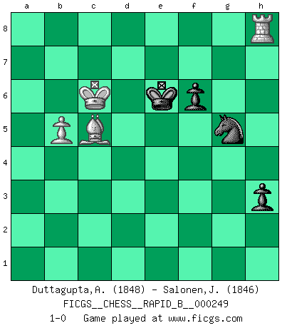 Last move : 1-0 2017 July 23 8:45:41 [Event "FICGS__CHESS__RAPID_B__000249"] [Site "FICGS"] [Date "2017.03.24"] [Round "1"] [White "Duttagupta,Aniruddha"] [Black "Salonen,Jukka"] [Result "1-0"] [WhiteElo "1848"] [BlackElo "1846"] 1.d4 d5 2.c4 e6 3.Nf3 Nf6 4.g3 dxc4 5.Bg2 c5 6.O-O Nc6 7.Qa4 Bd7 8.Qxc4 cxd4 9.Nxd4 Rc8 10.Nc3 Nxd4 11.Qxd4 Bc5 12.Qh4 O-O 13.Bxb7 Rb8 14.Bf3 Rb4 15.Qg5 Bd4 16.Qd2 Qc7 17.Nd1 Rfb8 18.a3 Rc4 19.Ne3 Bxe3 20.Qxe3 e5 21.b4 Rc3 22.Qd2 Rc2 23.Qd3 Bb5 24.Qb3 Bxe2 25.Bxe2 Rxe2 26.Be3 Ng4 27.Rfc1 Qb7 28.Bc5 e4 29.Qd1 Qb5 30.a4 Qd3 31.Qxd3 exd3 32.Bxa7 Ra8 33.Bc5 f6 34.a5 Ne5 35.Kf1 Rb2 36.Rcb1 Rc2 37.Rd1 g5 38.f4 gxf4 39.gxf4 Nc6 40.Rxd3 Rxh2 41.Ra4 Rh4 42.Rf3 Ra6 43.Ke2 Kf7 44.Kd3 h5 45.Kc4 Ne5+ 46.Kb5 Nxf3 47.Kxa6 Rxf4 48.Kb6 Rg4 49.a6 h4 50.a7 Rg8 51.b5 Ke6 52.a8Q Rxa8 53.Rxa8 h3 54.Rh8 Ng5 55.Kc6 1-0 Queen's gambit declined Kingside Castling by player White (move 6) Kingside Castling by player Black (move 12) 10 pieces endgame at move 47 : White KRBPP , Black KRNPP WHITE : King + 1 Rook 1 Bishop 2 Pawns BLACK : King + 1 Rook 1 Knight 2 Pawns Promotion Queen by player White (move 52) 9 pieces endgame at move 52 : White KRBP , Black KRNPP WHITE : King + 1 Rook 1 Bishop 1 Pawn BLACK : King + 1 Rook 1 Knight 2 Pawns 8 pieces endgame at move 53 : White KRBP , Black KNPP WHITE : King + 1 Rook 1 Bishop 1 Pawn BLACK : King + 1 Knight 2 Pawns Player White won this chess game. Follow this game move after move (download)Chess opens and enriches your mind. (Saudin Robovic) Zeige mir drei Eröffnungsvarianten und ich beweise dir, dass zwei davon inkorrekt sind. (Emanuel Lasker) El Ajedrez es despiadado: debes de estar preparado para matar gente. (Nigel Short) Des combinaisons [dans le jeu d'échecs] pareilles à des mélodies. Je crois entendre pour ainsi dire la musique des coups... (Vladimir Nabokov) Always be a first-rate version of yourself, instead of a second-rate version of somebody else. (Judy Garland)