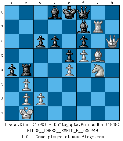 Last move : 1-0 2017 August 22 14:12:49 [Event "FICGS__CHESS__RAPID_B__000249"] [Site "FICGS"] [Date "2017.03.24"] [Round "1"] [White "Cease,Dion"] [Black "Duttagupta,Aniruddha"] [Result "1-0"] [WhiteElo "1790"] [BlackElo "1848"] 1.e4 c5 2.Nf3 d6 3.d4 cxd4 4.Nxd4 Nf6 5.Nc3 e6 6.g4 h6 7.h4 Nc6 8.Rg1 h5 9.gxh5 Nxh5 10.Bg5 Nf6 11.Nxc6 bxc6 12.Qf3 Qa5 13.O-O-O Rb8 14.Bc4 Nd7 15.Bb3 Nc5 16.h5 Nxb3+ 17.axb3 f6 18.Bf4 e5 19.h6 Qc7 20.Be3 Be6 21.Kb1 Rb7 22.hxg7 Bxg7 23.Qe2 Bf8 24.f4 Qc8 25.f5 Bg8 26.Rg6 Be7 27.Qg2 Bf7 28.Rh1 Kd7 29.Rg7 Rxh1+ 30.Qxh1 Qf8 31.Qh7 Ke8 32.Nd1 Bd8 33.Nf2 a5 34.Ng4 a4 35.Qh6 Rb4 36.Bg5 1-0 Sicilian : Scheveningen, Keres attack Queenside Castling by player White (move 13) Player White won this chess game. Follow this game move after move (download)I am still a victim of Chess. It has all the beauty of art and much more. It cannot be commercialized. Chess is much purer than art in its social position. (Marcel Duchamp) Smyslow ist ein Beweis dafür, dass ich noch zehn Jahre spielen kann! [der 75 jährige über den 85 jährigen] (Viktor Kortschnoi) El Ajedrez es de 30 a 40 por ciento psicología. Uno no cuenta con esto cuando se juega contra una computadora. No lo puedo confundir. (Judith Polgar) La victoire dans une partie d'Echecs appartient la plupart du temps à celui qui voit un peu plus loin que l'adversaire. (Lasker) Crush them ! Make them suffer ! (General Grievous in Star Wars ep.3)