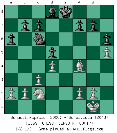 Last move : 1/2-1/2 2017 June 23 19:52:13 [Event "FICGS__CHESS__CLASS_A__000177"] [Site "FICGS"] [Date "2017.03.25"] [Round "1"] [White "Benassi,Aspasio"] [Black "Sorbi,Luca"] [Result "1/2-1/2"] [WhiteElo "2000"] [BlackElo "2043"] 1.e4 e5 2.Nf3 Nf6 3.Nxe5 d6 4.Nf3 Nxe4 5.d4 d5 6.Bd3 Nc6 7.O-O Be7 8.Nbd2 Bf5 9.Re1 Nxd2 10.Qxd2 Bxd3 11.Qxd3 O-O 12.c3 Qd7 13.Bf4 a6 14.Re2 Rae8 15.Rae1 Bd8 16.h4 Re7 17.Rxe7 Bxe7 18.h5 h6 19.Re3 Re8 20.Qe2 Kf8 21.Ne1 Bd8 22.Rxe8+ Qxe8 23.Qxe8+ Kxe8 24.Nc2 1/2-1/2 Petrov : Classical attack Kingside Castling by player White (move 7) Kingside Castling by player Black (move 11) This chess game ended in a draw. Follow this game move after move (download)A passed Pawn increases in strength as the number of pieces on the board diminishes. (Capablanca) Kasparov ist eine Art Monster mit hundert Augen, denen auch nicht das Geringste entgeht. (Tony Miles) Vive, pierde y aprende al observar a tu oponente como gana. (Amber Steenbock) L'action d'une oeuvre littéraire se déroule sur un champ de bataille. Les masques et les types du drame moderne correspondent aux pièces du jeu d'échecs. L'intrigue correspond aux coups et aux gambits, c'est à dire aux techniques du jeu telles qu'utilisées et interprétées par les joueurs. Les tactiques et les péripéties [mouvements] correspondent aux coups exécutés par l'adversaire. (Viktor Shklovsky) All maxims have their antagonist maxims; proverbs should be sold in pairs, a single one being but a half truth. (William Mathews)