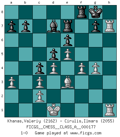 Last move : 1-0 2017 April 18 4:57:35 [Event "FICGS__CHESS__CLASS_A__000177"] [Site "FICGS"] [Date "2017.03.25"] [Round "1"] [White "Khanas,Valeriy"] [Black "Cirulis,Ilmars"] [Result "1-0"] [WhiteElo "2162"] [BlackElo "2055"] 1.d4 e6 2.e4 d5 3.Nc3 Bb4 4.e5 Ne7 5.a3 Bxc3+ 6.bxc3 c5 7.Qg4 O-O 8.Bd3 c4 9.Bh6 Ng6 10.Bxg6 fxg6 11.Be3 Nc6 12.h4 Qe8 13.h5 gxh5 14.Rxh5 Ne7 15.Kd2 Rf5 16.Rh6 Bd7 17.Ne2 Kh8 18.Rh2 Qg6 19.f3 Qxg4 20.fxg4 R5f8 21.Rah1 Ng6 22.Rxh7+ Kg8 23.Ng3 Rae8 24.Nh5 Re7 25.g3 Ba4 26.Nf4 Nxf4 27.gxf4 Bd7 28.Kd1 1-0 Queen's pawn Kingside Castling by player Black (move 7) Player White won this chess game. Follow this game move after move (download)The combination player thinks forward; he starts from the given position, and tries the forceful moves in his mind. (Emanuel Lasker) Wenn du gegen Bobby spielst, ist es keine Frage von gewinnen oder verlieren. Es ist eine Frage des Überlebens. (Boris Vassilievich Spassky) Mis oponentes también hacen buenas movidas. A veces yo no tomo esas cosas en consideración. (Bobby Fischer) La guerre est enfant de la passion, la passion est enfant du narcissisme et le narcissisme est l'enfant. (...) Une autre partie ? (Thibault de Vassal) They say poker is a zero-sum game. It must be, because every time I play my sum ends up zero. (Max Shapiro)