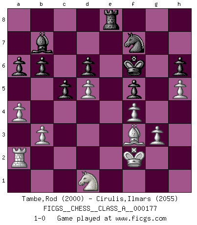 Last move : 1-0 2017 June 1 23:22:35 [Event "FICGS__CHESS__CLASS_A__000177"] [Site "FICGS"] [Date "2017.03.25"] [Round "1"] [White "Tambe,Rod"] [Black "Cirulis,Ilmars"] [Result "1-0"] [WhiteElo "2000"] [BlackElo "2055"] 1.c4 e6 2.d4 Nf6 3.Nc3 Bb4 4.Nf3 b6 5.Qb3 c5 6.Bg5 h6 7.Bh4 g5 8.Bg3 Ne4 9.e3 Nc6 10.Qc2 f5 11.d5 Na5 12.Be5 Rf8 13.a3 Bxc3+ 14.Bxc3 Nxc3 15.Qxc3 exd5 16.cxd5 Nb7 17.Ne5 Qf6 18.f4 d6 19.Nf3 Ke7 20.Qxf6+ Kxf6 21.Kf2 Bd7 22.Ba6 Nd8 23.a4 Bc8 24.Bc4 Bb7 25.h4 gxf4 26.exf4 Re8 27.g3 a6 28.Rhd1 Nf7 29.h5 Bc8 30.Ra3 Re4 31.Nd2 Rd4 32.Be2 Rb4 33.Nc4 Rb8 34.b3 Bb7 35.Bf3 Re8 36.Ne3 Rd4 37.Ra2 Rxd1 38.Nxd1 1-0 English Opening Player White won this chess game. Follow this game move after move (download)Adequate compensation for a sacrifice is having a sound combination leading to a winning position; adequate compensation for a blunder is having your opponent snatch defeat from the jaws of victory. (Bruce A. Moon) Immer nach dem besten Zug zu suchen ist ziemlich unpraktisch. (Nigel Short) Yo nunca en mi vida he jugado la Defensa Francesa, que viene siendo la más aburrida de todas las Aperturas. (Wilhelm Steinitz) Les Echecs représentent une sphère d'idées créatrices basée sur la volonté des deux protagonistes. (Smyslov) Before all elsed, be armed. (Niccolo Machiavelli)