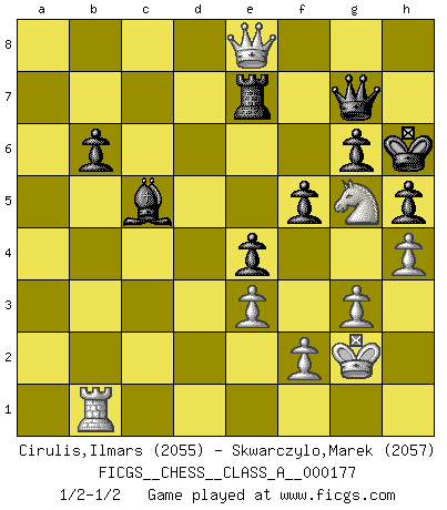Last move : 1/2-1/2 2017 September 5 15:8:19 [Event "FICGS__CHESS__CLASS_A__000177"] [Site "FICGS"] [Date "2017.03.25"] [Round "1"] [White "Cirulis,Ilmars"] [Black "Skwarczylo,Marek"] [Result "1/2-1/2"] [WhiteElo "2055"] [BlackElo "2057"] 1.b4 e5 2.a3 d5 3.Bb2 Bd6 4.Nf3 Nd7 5.e3 Ngf6 6.d4 exd4 7.Bxd4 O-O 8.Be2 c6 9.O-O Qe7 10.Nbd2 a5 11.bxa5 Rxa5 12.c4 Rxa3 13.cxd5 cxd5 14.Rxa3 Bxa3 15.Qc2 Bd6 16.Rc1 Rd8 17.Nf1 Ne4 18.N1d2 Nf8 19.Nxe4 dxe4 20.Nd2 Bf5 21.Nc4 Bc5 22.Bc3 b6 23.Rb1 Nd7 24.Qb2 f6 25.Nd2 Bg6 26.Nb3 Ba3 27.Qc2 Rc8 28.Nd4 h5 29.Ba6 Rf8 30.Qb3+ Bf7 31.Bc4 Bxc4 32.Qxc4+ Qf7 33.Qa4 Bc5 34.Ne2 f5 35.h4 Nf6 36.Bxf6 Qxf6 37.Nf4 Kh7 38.g3 Kh6 39.Kg2 Rd8 40.Qa2 Rd7 41.Nh3 g6 42.Ng5 Qg7 43.Qa8 Ra7 44.Qe8 Re7 1/2-1/2 Polish (Sokolsky) opening Kingside Castling by player Black (move 7) Kingside Castling by player White (move 9) This chess game ended in a draw. Follow this game move after move (download)There is only one thing Fischer does in Chess without pleasure: to lose ! (Boris Spassky) Ich habe Putins Aufstieg an die Macht beobachtet und seine Politik, die demokratischen Institutionen meines Landes zu zerstören. (Garry Kasparov) El Ajedrez expande y enriquece tu mente. (Saudin Robovic) Lorsque vous vous retrouvez devant une position atroce, ne tendez pas un ultime piège dérisoire avec l'intention d'abandonner si l'adversaire le déjoue ! Faites-vous plutôt un devoir de résister comme si votre vie en dépendait. Jouez le coup qui vous déplairait au centuple si vous étiez dans la peau de votre tortionnaire ! If you work for a living, why do you kill yourself working ? (Tuco to a chicken in The Good, The Bad and The Ugly)