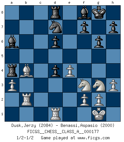 Last move : 1/2-1/2 2017 April 14 21:59:24 [Event "FICGS__CHESS__CLASS_A__000177"] [Site "FICGS"] [Date "2017.03.25"] [Round "1"] [White "Dusk,Jerzy"] [Black "Benassi,Aspasio"] [Result "1/2-1/2"] [WhiteElo "2084"] [BlackElo "2000"] 1.e4 e5 2.Nf3 Nc6 3.Bb5 a6 4.Ba4 Nf6 5.O-O Be7 6.Re1 b5 7.Bb3 d6 8.c3 O-O 9.h3 Na5 10.Bc2 c5 11.d4 Nd7 12.Nbd2 cxd4 13.cxd4 Nc6 14.Nb3 a5 15.Bd3 a4 16.Bxb5 Qb6 17.Bxc6 Qxc6 18.Nbd2 Rd8 19.Nf1 Bf8 20.Ng3 Ba6 21.Bd2 g6 22.a3 Qb6 23.Qxa4 Qxb2 24.Reb1 Bd3 25.Rxb2 Rxa4 26.Rd1 Ba6 27.Bb4 exd4 1/2-1/2 Ruy Lopez : Closed Kingside Castling by player White (move 5) Kingside Castling by player Black (move 8) This chess game ended in a draw. Follow this game move after move (download)The most important feature of the Chess position is the activity of the pieces. This is absolutely fundamental in all phases of the game: Opening, Middlegame and especially Endgame. The primary constraint on a piece's activity is the Pawn structure. (Michael Stean) Rubinstein ist ein Turmendspiel, welches die Götter vor tausenden von Jahren begannen. (Savielly Grigorievitsch Tartakower) El Ajedrez es 99 por ciento táctica. (Teichmann) Dans le domaine de la peinture, de la gravure et de la sculpture, dès la première décennie de notre siècle, les artistes abandonnent la représentation de la partie d'échecs pour se concentrer sur les pièces, sur les échiquiers et sur toutes les variations auxquelles les unes et les autres peuvent donner lieu. On passe en quelque sorte d'un thème social à un thème musical (au sens de la musica médiévale, c'est-à-dire d'une notion qui inclue le rythme, l'harmonie, la construction et la déconstruction, etc.). Graphiquement et picturalement, l'échiquier apparaît comme une structure ouverte, dynamique, d'une richesse infinie, autorisant toutes les combinatoires et débouchant sur des mouvements et des rythmes de nature exponentielle. (Michel Pastoureau) Imagination is more important than knowledge. Knowledge is limited. Imagination encircles the world. (Albert Einstein)