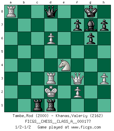 Last move : 1/2-1/2 2017 April 10 18:5:20 [Event "FICGS__CHESS__CLASS_A__000177"] [Site "FICGS"] [Date "2017.03.25"] [Round "1"] [White "Tambe,Rod"] [Black "Khanas,Valeriy"] [Result "1/2-1/2"] [WhiteElo "2000"] [BlackElo "2162"] 1.e4 c6 2.d4 d5 3.exd5 cxd5 4.c4 Nf6 5.Nc3 Nc6 6.Bg5 Be6 7.Nf3 g6 8.Bxf6 exf6 9.c5 Bg7 10.Bb5 Bg4 11.h3 Bxf3 12.Qxf3 O-O 13.O-O-O f5 14.Qf4 Rc8 15.Bxc6 bxc6 16.Rhe1 Rb8 17.Re2 Rb4 18.a3 Rb7 19.Kb1 Bf6 20.g4 Bg5 21.Qg3 Bh4 22.Qg2 Qd7 23.b4 fxg4 24.Qxg4 Qd8 25.Qf3 Qa5 26.Ra2 Rfb8 27.Kc2 Qd8 28.b5 cxb5 29.Nxd5 a5 30.c6 Rc8 31.Nc3 Rb6 32.d5 Bf6 33.Rd3 Bg7 34.Ne4 a4 35.Kd1 b4 36.axb4 Rxb4 37.d6 Rb1+ 38.Ke2 Rxc6 39.Rxa4 R6c1 40.Ra8 Re1+ 41.Kd2 Rbd1+ 42.Kc2 Rc1+ 43.Kd2 Red1+ 1/2-1/2 Caro-Kann : Panov-Botvinnik attack Kingside Castling by player Black (move 12) Queenside Castling by player White (move 13) This chess game ended in a draw. Follow this game move after move (download)The tactician must know what to do whenever something needs doing; the strategist must know what to do when nothing needs doing. (Savielly Tartakover) Du musst nicht gut spielen, es reicht, wenn du besser spielst als dein Gegner. (Anonymous) Uno no tiene que jugar muy bien, es suficiente jugar mejor que el oponente. (Siegbert Tarrasch) Ce n'est pas pour s'amuser qu'il joue aux échecs : il célèbre un culte. (Vladimir Nabokov) I couldn't make any sense out of what this particular thread is about. It sounds like R2 D2 computer speaking. A space fight ?!? Some 'command' problems in Moscow ? Some killers & narcotic addicts attacking some game & a god wannabe ?? (Dinesh De Silva, lost in a russian conflict in FICGS forum)