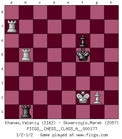 Last move : 1/2-1/2 2017 April 10 22:9:48 [Event "FICGS__CHESS__CLASS_A__000177"] [Site "FICGS"] [Date "2017.03.25"] [Round "1"] [White "Khanas,Valeriy"] [Black "Skwarczylo,Marek"] [Result "1/2-1/2"] [WhiteElo "2162"] [BlackElo "2057"] 1.d4 d5 2.c4 c6 3.Nc3 Nf6 4.Nf3 e6 5.Bg5 h6 6.Bh4 dxc4 7.e4 g5 8.Bg3 b5 9.Be2 Bb7 10.h4 g4 11.Ne5 h5 12.O-O Nbd7 13.Qc2 Nxe5 14.Bxe5 Bg7 15.b3 cxb3 16.axb3 O-O 17.Bg3 c5 18.e5 Nd5 19.dxc5 Nxc3 20.Qxc3 Qd5 21.f3 Rfc8 22.Rac1 Bf8 23.Bf2 g3 24.Be3 b4 25.Qxb4 Qxe5 26.Qd4 Qxd4 27.Bxd4 e5 28.Bxe5 Bxc5+ 29.Kh1 Bf2 30.f4 Bd5 31.b4 Be3 32.Ra1 Rc2 33.Bf3 Bxf3 34.Rxf3 Bf2 35.f5 Kh7 36.Bxg3 Bxg3 37.Rxg3 Rc4 38.b5 Rxh4+ 39.Kg1 Rb4 40.Ra5 h4 41.Rc3 Kh6 42.Rc6+ Kg5 43.Rc7 Rb1+ 44.Kf2 f6 45.Rg7+ Kf4 46.Rh7 Rb8 47.Rxh4+ Kg5 48.Rh7 R8xb5 49.Rhxa7 Kxf5 50.Rxb5+ 1/2-1/2 QGD Slav defense Kingside Castling by player White (move 12) Kingside Castling by player Black (move 16) 10 pieces endgame at move 48 : White KRRPP , Black KRRPP WHITE : King + 2 Rooks 2 Pawns BLACK : King + 2 Rooks 2 Pawns 9 pieces endgame at move 49 : White KRRPP , Black KRRP WHITE : King + 2 Rooks 2 Pawns BLACK : King + 2 Rooks 1 Pawn 8 pieces endgame at move 49 : White KRRP , Black KRRP WHITE : King + 2 Rooks 1 Pawn BLACK : King + 2 Rooks 1 Pawn 7 pieces endgame at move 50 : White KRRP , Black KRP WHITE : King + 2 Rooks 1 Pawn BLACK : King + 1 Rook 1 Pawn This chess game ended in a draw. Follow this game move after move (download)No other master has such a terrific will to win. At the board he radiates danger, and even the strongest opponents tend to freeze, like rabbits when they smell a panther. Even his weaknesses are dangerous. As white, his opening game is predictable - you can make plans against it - but so strong that your plans almost never work. In the middle game his precision and invention are fabulous, and in the end game you simply cannot beat him. (Anonymous German Expert) Ein Buch ist ein Spiegel; wenn ein Affe hineinsieht, so kann kein Apostel heraus gucken. (Georg Christoph Lichtenberg) Cada Peón es una Reina en potencia. (James Mason) Comme les marins qui ont mille raisons différentes d'aller en mer, les joueurs d'échecs en ont tout autant avant de s'installer devant une table et jouer... (Vincent Bertignac, philosophe) I teach you to lie, cheat and steal, and as soon as my back's turned you wait in line ? (Gregory House, House M.D.)