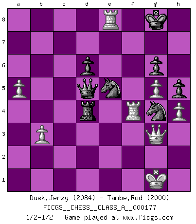 Last move : 1/2-1/2 2017 May 23 20:25:23 [Event "FICGS__CHESS__CLASS_A__000177"] [Site "FICGS"] [Date "2017.03.25"] [Round "1"] [White "Dusk,Jerzy"] [Black "Tambe,Rod"] [Result "1/2-1/2"] [WhiteElo "2084"] [BlackElo "2000"] 1.e4 d6 2.d4 Nf6 3.Nc3 g6 4.Be3 c6 5.Qd2 Bg7 6.f3 b5 7.h4 Nbd7 8.g4 h5 9.g5 Nh7 10.Nge2 O-O 11.f4 b4 12.Nd1 c5 13.f5 Bb7 14.Bg2 Re8 15.O-O Nhf8 16.c3 bxc3 17.Ndxc3 cxd4 18.Bxd4 Bxd4+ 19.Nxd4 Qb6 20.Na4 Qa6 21.b3 Rac8 22.fxg6 fxg6 23.Rfd1 Ba8 24.Nc3 Ne5 25.Nd5 Nfd7 26.a4 Bxd5 27.exd5 Qb7 28.a5 a6 29.Rdc1 Ng4 30.Rc6 Rb8 31.Qc2 Nde5 32.Rb6 Qd7 33.Rxa6 Kh7 34.Qc3 Rf8 35.Re1 Rf2 36.Rc6 Qe8 37.Rc7 Qf7 38.Qg3 Rb4 39.Re4 Ra2 40.Rf4 Rxg2+ 41.Kxg2 Qxd5+ 42.Kg1 Rxd4 43.Rxe7+ Kg8 44.Re8+ 1/2-1/2 Pirc : 150 attack Kingside Castling by player Black (move 10) Kingside Castling by player White (move 15) This chess game ended in a draw. Follow this game move after move (download)All that matters on the Chessboard is good moves. (Bobby Fischer) Auf Remis zu spielen ist gewissermaßen ein Verbrechen gegen das Schachspiel. (Mikhail Nekhemyevich Tal) a manera como él juega al Ajedrez, demuestra la completa naturaleza de un hombre. (Stanley Ellin) C'est une question de caractère, Beaucoup de gens perdent leur motivation très vite. D'autres, ils sont rares, peuvent la conserver très longtemps. J'aime les échecs, encore aujourd'hui je suis heureux d'analyser des parties. J'aime toujours gagner, je déteste encore perdre. Bien jouer est important pour mon intégrité intellectuelle et morale. Et puis les échecs vivent en ce moment une période historique grâce à Internet. Ils se développent dans les systèmes éducatifs à travers le monde. Ils sortent de leur ghetto, et c'est mon rôle de mener à bien cette révolution. (Gary Kasparov) The project of the man are lower than those of the sky. (Chinese proverb)