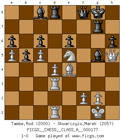 Last move : 1-0 2017 May 18 8:50:47 [Event "FICGS__CHESS__CLASS_A__000177"] [Site "FICGS"] [Date "2017.03.25"] [Round "1"] [White "Tambe,Rod"] [Black "Skwarczylo,Marek"] [Result "1-0"] [WhiteElo "2000"] [BlackElo "2057"] 1.d4 d5 2.c4 c6 3.Nf3 Nf6 4.Nc3 e6 5.Bg5 h6 6.Bxf6 Qxf6 7.e3 Nd7 8.Bd3 dxc4 9.Bxc4 g6 10.O-O Bg7 11.Qc2 Qe7 12.Rfe1 O-O 13.Rad1 b5 14.Be2 a6 15.Ne4 Bb7 16.Rc1 Rfd8 17.a3 Rac8 18.b4 Kh7 19.h4 Kg8 20.Red1 Ra8 21.Nc5 Nxc5 22.bxc5 Rd5 23.e4 R5d8 24.e5 Rd5 25.a4 Rad8 26.Ra1 R5d7 27.Qe4 Qe8 28.h5 gxh5 29.Qh4 Bf8 30.Bd3 Bg7 31.a5 Qf8 32.Qxh5 f6 33.exf6 Bxf6 34.Ra3 Rg7 35.Be4 Bc8 36.Rad3 Bg5 37.Ne5 1-0 QGD Slav : 4.Nc3 Kingside Castling by player White (move 10) Kingside Castling by player Black (move 12) Player White won this chess game. Follow this game move after move (download)I'd rather have a Pawn than a finger. (Reuben Fine) Es war undenkbar für die Behörden, dass ein sowjetischer Großmeister auf diese Art und Weise [Fischer-Taimanov 6:0] verliert, ohne dass es eine politischer Erklärung dafür gäbe. (Mark Taimanov) La batalla por la última verdad nunca sera ganada. Y es por eso que el Ajedrez es tan fascinante. (Hans Kmoch) La vie est comme un jeu d'échecs : nous esquissons un plan, mais celui-ci est tributaire de ce que daignent faire l'adversaire aux échecs et le destin dans la vie. (Arthur Schopenhauer) First of all, we have to go back to the classical time control. (Anatoly Karpov)