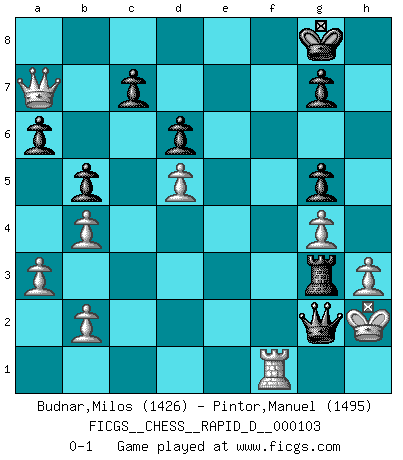 Last move : 0-1 2017 May 15 20:20:47 [Event "FICGS__CHESS__RAPID_D__000103"] [Site "FICGS"] [Date "2017.03.28"] [Round "1"] [White "Budnar,Milos"] [Black "Pintor,Manuel"] [Result "0-1"] [WhiteElo "1426"] [BlackElo "1495"] 1.e4 e5 2.Nf3 Nc6 3.Bb5 a6 4.Ba4 Nf6 5.Nc3 b5 6.Bb3 d6 7.h3 Be7 8.d4 h6 9.O-O O-O 10.a3 Na5 11.d5 Nxb3 12.cxb3 Nh7 13.b4 Bd7 14.Be3 f5 15.exf5 Bxf5 16.g4 Bg6 17.Qe2 e4 18.Nd4 Qd7 19.f3 exf3 20.Rxf3 Bg5 21.Ne6 Rxf3 22.Qxf3 Bxe3+ 23.Qxe3 Re8 24.Qd4 Ng5 25.Nxg5 hxg5 26.Rf1 Re5 27.Qf2 Qe7 28.Qa7 Re3 29.Kg2 Be4+ 30.Nxe4 Qxe4+ 31.Kg1 Rg3+ 32.Kh2 Qg2+ 0-1 Ruy Lopez : Four knights (Tarrasch) variation Kingside Castling by player White (move 9) Kingside Castling by player Black (move 9) Player Black won this chess game. Follow this game move after move (download)Fischer prefers to enter Chess history alone. (Miguel Najdorf) Ich möchte Schüler heranbilden, die das Vermögen haben, selbst zu denken und Kritik zu üben. (Emanuel Lasker) Muchos jugadores de Ajedrez se sorprendían cuando después de la partida, Fischer explicaba con calma: 'Yo ya había analizado esta posibilidad' en una posición en la cual yo creía que no era posible de prever desde la apertura. (Mikhail Tal) Roi des jeux et jeu des rois, les échecs portent en eux un sentiment d'infini. Ils donnent à celui qui s'est efforcé d'en approfondir les arcanes l'impression de n'être pas à la mesure de l'homme; en fait, ils constituent un résumé de l'univers, un microcosme, et figurent cette grande échelle qui, dans les plans de la lumière descend jusqu'à la matière, qui des abîmes insondables remonte jusqu'en l'infini de Dieu. (Pyrame) A good programmer is someone who always looks both ways before crossing a one-way street. (Doug Linder)
