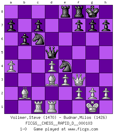 Last move : 1-0 2017 May 17 16:10:2 [Event "FICGS__CHESS__RAPID_D__000103"] [Site "FICGS"] [Date "2017.03.28"] [Round "1"] [White "Vollmer,Steve"] [Black "Budnar,Milos"] [Result "1-0"] [WhiteElo "1470"] [BlackElo "1426"] 1.d4 Nf6 2.c4 e6 3.Nf3 b6 4.Nc3 Bb7 5.e3 Bb4 6.Bd3 Bxc3+ 7.bxc3 O-O 8.O-O d5 9.Qe2 Ne4 10.Bb2 Nc6 11.Rfd1 Qf6 12.Rac1 Na5 13.Ne5 Bc6 14.Nxc6 Nxc6 15.cxd5 exd5 16.c4 Qe6 17.cxd5 Qxd5 18.Qf3 Rae8 19.a4 1-0 Queen's Indian : 4.Nc3 Kingside Castling by player Black (move 7) Kingside Castling by player White (move 8) Player White won this chess game. Follow this game move after move (download)By playing at Chess then, we may learn: First: Foresight... Second: Circumspection... Third: Caution... And lastly, we learn by Chess the habit of not being discouraged by present bad appearances in the state of our affairs, the habit of hoping for a favorable chance, and that of persevering in the secrets of resources. (Benjamin Franklin) Schach ist ein schwarz-weisser Dschungel. (Garry Kasparov) El Ajedrez es sobre todo, ¡una pelea!. (Emanuel Lasker) RxDa4 pat (...) The age of a woman doesn't mean a thing. The best tunes are played on the oldest fiddles. (Ralph Waldo Emerson)