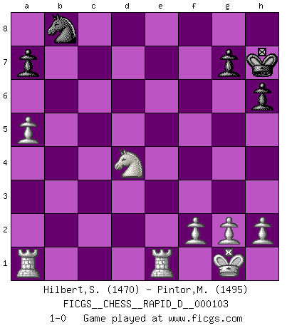 Last move : 1-0 2017 May 16 12:36:53 [Event "FICGS__CHESS__RAPID_D__000103"] [Site "FICGS"] [Date "2017.03.28"] [Round "1"] [White "Hilbert,Stephan J."] [Black "Pintor,Manuel"] [Result "1-0"] [WhiteElo "1470"] [BlackElo "1495"] 1.b4 e5 2.Bb2 e4 3.d3 exd3 4.cxd3 Bxb4+ 5.Nd2 Nf6 6.e3 O-O 7.Ngf3 h6 8.a3 Ba5 9.Be2 d6 10.O-O Bg4 11.Nc4 Bb6 12.a4 Bc5 13.Qb3 Bb6 14.a5 Bc5 15.Bxf6 Qxf6 16.d4 d5 17.Nce5 Bxf3 18.Bxf3 Qd6 19.Bxd5 c6 20.Bxf7+ Rxf7 21.Qxf7+ Kh7 22.Qxb7 Bxd4 23.exd4 Qxd4 24.Rfe1 Nd7 25.Nxc6 Rb8 26.Qxb8 Nxb8 27.Nxd4 1-0 Polish (Sokolsky) opening Kingside Castling by player Black (move 6) Kingside Castling by player White (move 10) Player White won this chess game. Follow this game move after move (download)Fischer prefers to enter Chess history alone. (Miguel Najdorf) Ich hatte Angst gegen einen russischen Großmeister zu verlieren, und er befürchtete gegen einen kleinen Jungen zu verlieren. (über ein Remis gegen Juri Awerbach). (Robert James Fischer) Bobby Fischer es el jugador de Ajedrez mas grande que jamás haya existido. (Ken Smith) La vie et les Echecs sont tous les deux une lutte constante. (Lasker) The Internet is the first thing that humanity has build that humanity doesn't understand, the largest experiment in anarchy that we have ever had. (Eric Schmidt)