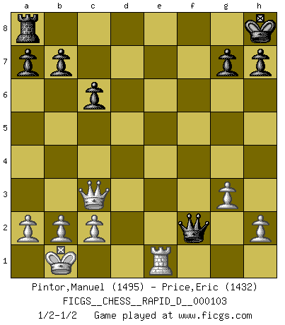 Last move : 1/2-1/2 2017 April 7 16:35:17 [Event "FICGS__CHESS__RAPID_D__000103"] [Site "FICGS"] [Date "2017.03.28"] [Round "1"] [White "Pintor,Manuel"] [Black "Price,Eric"] [Result "1/2-1/2"] [WhiteElo "1495"] [BlackElo "1432"] 1.e4 e5 2.f4 d5 3.exd5 e4 4.Nc3 Nf6 5.Bc4 Bc5 6.d4 exd3 7.Qxd3 O-O 8.Bd2 Re8+ 9.Nge2 Ng4 10.Ne4 Bf5 11.N2g3 Nf2 12.Qf3 Bxe4 13.Nxe4 Nxe4 14.O-O-O Nf2 15.Bc3 Nd7 16.d6 c6 17.Qh5 Be3+ 18.Kb1 Rf8 19.Rd3 Nxd3 20.Bxd3 f5 21.Bxf5 Rxf5 22.Qxf5 Nf6 23.Qe6+ Kh8 24.Qxe3 Qxd6 25.Re1 Nd5 26.Qd3 Nxc3+ 27.Qxc3 Qxf4 28.g3 Qf2 1/2-1/2 KGD : Falkbeer, 3...e4 Kingside Castling by player Black (move 7) Queenside Castling by player White (move 14) This chess game ended in a draw. Follow this game move after move (download)During a Chess competition a Chessmaster should be a combination of a beast of prey and a monk. (Alexander Alekhine) Ich habe kein Problem mit Frauen, sondern nur mit dem Niveau ihres Schachspiels (Judith Polgar) En el tablero, la mentira e hipocresía no sobreviven mucho. (Emanuel Lasker) Les Echecs représentent une sphère d'idées créatrices basée sur la volonté des deux protagonistes. (Smyslov) A generalist learns less and less about more and more until he knows nothing about everything. (Author unknown)