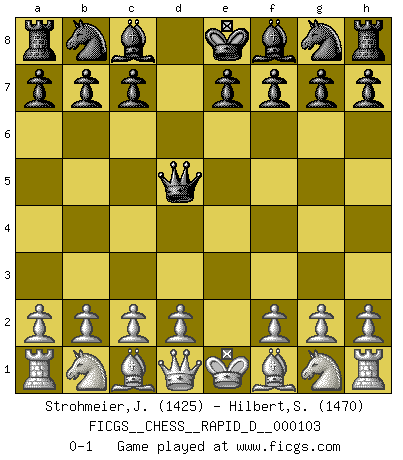 Last move : 0-1 2017 April 22 16:29:15 [Event "FICGS__CHESS__RAPID_D__000103"] [Site "FICGS"] [Date "2017.03.28"] [Round "1"] [White "Strohmeier,Josef"] [Black "Hilbert,Stephan J."] [Result "0-1"] [WhiteElo "1425"] [BlackElo "1470"] 1.e4 d5 2.exd5 Qxd5 0-1 Scandinavian (centre counter) defense Player Black won this chess game. Follow this game move after move (download)In Fischer's hands, a slight theoretical advantage is as good a being a Queen ahead. (Isaac Kashdan) Schach ist gnadenlos. Du mußt bereit sein zu töten. (Nigel Short) Cuando tengo las piezas blancas, yo gano porque soy blanco; Cuando tengo las piezas negras, yo gano porque soy Bogolyubov. (Bogolyubov) Même si l'adversaire joue le coup analysé précédemment, recommencez l'analyse en voyant la nouvelle position. Première règle de Blumenfeld Macintosh - we might not get everything right, but at least we knew the century was going to end. (Douglas Adams)