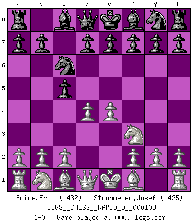 Last move : 1-0 2017 April 5 9:6:53 [Event "FICGS__CHESS__RAPID_D__000103"] [Site "FICGS"] [Date "2017.03.28"] [Round "1"] [White "Price,Eric"] [Black "Strohmeier,Josef"] [Result "1-0"] [WhiteElo "1432"] [BlackElo "1425"] 1.e4 c5 2.Nf3 Nc6 3.d4 1-0 Sicilian defense Player White won this chess game. Follow this game move after move (download)Who is your opponent tonight, tonight I am playing against the Black pieces. (Akiba Rubinstein) Gewinnen beim Schach fördert das Selbstvertrauen. Beim Sex spüre ich sowas nicht... (Garry Kasparov) Solo puedes ser bueno en el Ajedrez si amas al juego. (Bobby Fischer) Je fais ceci parce que dans cinquante coups j'obtiendrai cela; je m'appelle Mikhail Moisevitch Botvinnik. (Botvinnik) A mistake is only a mistake if you let it happen twice. Otherwise it is a learning experience. (Daniel Parmet)