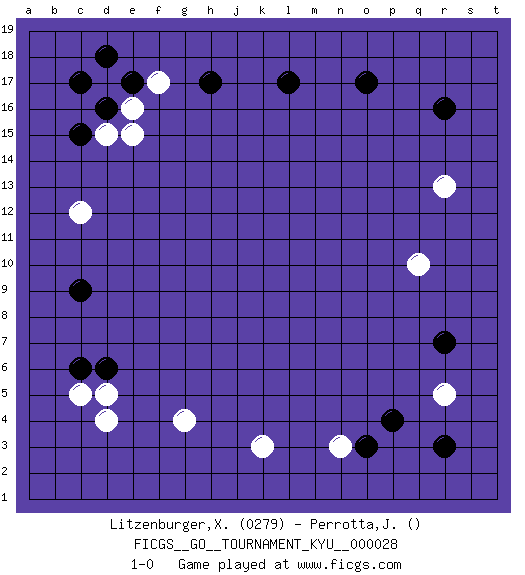 Last move : 1-0 2007 June 1 5:46:27 [Event "FICGS__GO__TOURNAMENT_KYU__000028 "] [Site "FICGS"] [Date "2007.04.05"] [Round "1"] [Black "Litzenburger,Xavier "] [White "Perrotta,John Zach "] [Result "1-0"] [Rating 1 "0279"] 1.d16 q10 2.r16 r5 3.r3 d4 4.p4 f17 5.h17 d17 6.c17 e16 7.d18 e15 8.e17 d15 9.c15 c12 10.c6 c5 11.d6 d5 12.c9 n3 13.o3 k3 14.o17 r13 15.l17 g4 16.r7 1-0 This go game has been lost on time (started : 2007.04.05 3:15:26) Here are the names of the openings (joseki) played in the four corners : Corner q4 : r5 r3Mokuhazushi (Waemok, Wai`mu`) 5-3 Point. The mokuhazushi (5-3) point was popular in the Edo period in Japan (1600 - 1867). It emphasizes influence; territorially, it is inferior to the 3-4 point.San-san. Black goes for profit at the expense of influence. A ladder helps Black when playing 2. Corner d16 : d16 f17Hoshi (Hwajeom, Seongjeom, Xingwei`) 4-4 Point. The star or hoshi (4-4) point, emphasizing influence at the potential expense of territory.Ikken Kakari (Hankan Keolch'im, Yi Gua`jiao~, 1-Space Low Approach). White 2 is the standard approach move to the 4-4. Corner d4 : d4 c6Hoshi (Hwajeom, Seongjeom, Xingwei`) 4-4 Point. The star or hoshi (4-4) point, emphasizing influence at the potential expense of territory.Ikken Kakari (Hankan Keolch'im, Yi Gua`jiao~, 1-Space Low Approach). Black 2 is the standard approach move to the 4-4. Player Black won this Go (weiqi, baduk) game.Follow this game move after move (download ) Connect with good shape. (Anonymous) Every man's memory is his private literature. (Aldous Huxley)