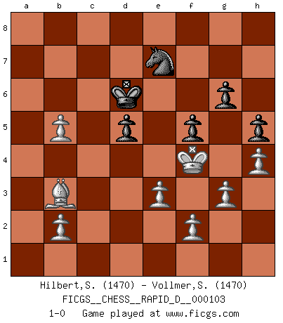 Last move : 1-0 2017 June 18 11:56:42 [Event "FICGS__CHESS__RAPID_D__000103"] [Site "FICGS"] [Date "2017.03.28"] [Round "1"] [White "Hilbert,Stephan J."] [Black "Vollmer,Steve"] [Result "1-0"] [WhiteElo "1470"] [BlackElo "1470"] 1.d4 Nf6 2.Nf3 d5 3.c4 e6 4.g3 Bb4+ 5.Bd2 Bxd2+ 6.Nbxd2 O-O 7.Bg2 Nc6 8.Rc1 Qe7 9.O-O Bd7 10.a3 a5 11.Re1 Ne4 12.e3 f5 13.Nb1 Rad8 14.cxd5 exd5 15.Qb3 Qd6 16.Nc3 Nxc3 17.Rxc3 b6 18.Rec1 Rc8 19.Ne5 Ne7 20.Bf1 c5 21.Nxd7 Qxd7 22.dxc5 bxc5 23.Rxc5 Rxc5 24.Rxc5 a4 25.Bb5 axb3 26.Bxd7 Rd8 27.Rc7 Kf8 28.Rb7 g6 29.Ba4 Rc8 30.Bxb3 Rc1+ 31.Kg2 h5 32.a4 Rc5 33.Rb5 Rxb5 34.axb5 Ke8 35.h4 Kd7 36.Kf3 Kd6 37.Kf4 1-0 Queen's pawn game Kingside Castling by player Black (move 6) Kingside Castling by player White (move 9) Player White won this chess game. Follow this game move after move (download)Look at Garry Kasparov. After he loses, invariably he wins the next game. He just kills the next guy. That's something that we have to learn to be able to do. (Maurice Ashley) Über Kasparov: Es ist offensichtlich, daß er in einem totalitären Staat aufwuchs und deshalb zu diktatorischen Zügen neigt. (Viktor Kortschnoi) ¿Porque tengo que perder ante este idiota?. (Aron Nimzovich) Horreur, mais aussi harmonie suprême : qu'y avait-il en effet au monde en dehors des échecs ? Le brouillard, l'inconnu, le non-être... (Vladimir Nabokov) Once you start thinking you have nothing left to learn, you have everything to learn. (Steve Badget)