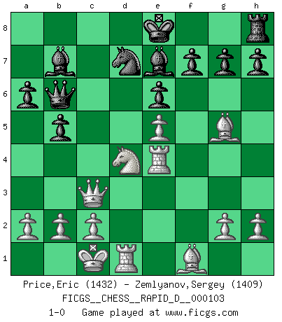 Last move : 1-0 2017 May 20 16:50:58 [Event "FICGS__CHESS__RAPID_D__000103"] [Site "FICGS"] [Date "2017.03.28"] [Round "1"] [White "Price,Eric"] [Black "Zemlyanov,Sergey"] [Result "1-0"] [WhiteElo "1432"] [BlackElo "1409"] 1.e4 c5 2.Nf3 d6 3.d4 cxd4 4.Nxd4 Nf6 5.Nc3 a6 6.Bg5 Nbd7 7.f4 e6 8.Qf3 Qc7 9.O-O-O b5 10.Bd3 Bb7 11.Rhe1 Qb6 12.Bf1 Be7 13.Qh3 Rc8 14.e5 dxe5 15.fxe5 Rxc3 16.Qxc3 Ne4 17.Rxe4 1-0 This chess game has been lost on time (started : 2017.03.28 1:0:22) Sicilian : Najdorf, 6.Bg5 Queenside Castling by player White (move 9) Player White won this chess game. Follow this game move after move (download)Later, I began to succeed in decisive games. Perhaps because I realized a very simple truth: not only was I worried, but also my opponent. (Mikhail Tal) Schachspieler können ausgezeichnet Varianten am Schachbrett berechnen, aber nicht im realen Leben. Zu stark ist der Individualismus im Schach ausgeprägt, und für viele ist ein kleiner momentaner persönlicher Vorteil wichtiger als ein weit größerer Vorteil von morgen. (Anatoly Karpov) El Ajedrez era la lengua materna de Capablanca. (Reti) Shah mat. Le roi est mort. Cri de fierté d'un joueur venant de terrasser son adversaire, courtoisement, sans effusion de sang. There will be no order, only chaos. (Sol Robeson in Pi by Darren Aronofsky)