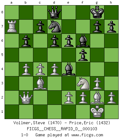 Last move : 1-0 2017 March 29 2:30:9 [Event "FICGS__CHESS__RAPID_D__000103"] [Site "FICGS"] [Date "2017.03.28"] [Round "1"] [White "Vollmer,Steve"] [Black "Price,Eric"] [Result "1-0"] [WhiteElo "1470"] [BlackElo "1432"] 1.Nf3 Nf6 2.g3 b6 3.Bg2 Bb7 4.d4 e6 5.O-O Be7 6.c4 O-O 7.Nc3 Ne4 8.Nxe4 Bxe4 9.Bd2 f5 10.Bc3 Bf6 11.Rc1 Qe7 12.a3 a5 13.b4 axb4 14.axb4 d6 15.Qb3 Nd7 16.Qb2 Ra7 17.Ra1 Rfa8 18.Rxa7 Rxa7 19.Ra1 Qd8 20.Rxa7 1-0 Reti Opening Kingside Castling by player White (move 5) Kingside Castling by player Black (move 6) Player White won this chess game. Follow this game move after move (download)Excellence at Chess is one mark of a scheming mind. (Sir Arthur Conan Doyle) Unter Putin wird alles Geld aus Russland wie von einem Staubsauger nach Moskau umgeleitet, das ist wie ein schwarzes Loch. (Garry Kasparov) Cuando tengas duda... ¡juega al Ajedrez!. (Tevis) J'apprécie les joueurs d'est-indienne, c'est grâce à eux que je nourris ma famille depuis tant d'années. (Petrosian) Man is reluctant to give credit for intelligence to anyone, except his enemies. (Albert Einstein)