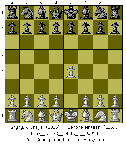 Last move : 1-0 2017 April 28 1:3:31 [Event "FICGS__CHESS__RAPID_C__000138"] [Site "FICGS"] [Date "2017.03.28"] [Round "1"] [White "Grynyuk,Vasyl"] [Black "Benone,Mateia"] [Result "1-0"] [WhiteElo "1886"] [BlackElo "1359"] 1.e4 1-0 This chess game has been lost on time (started : 2017.03.28 15:22:28) King's pawn Opening Player White won this chess game. Follow this game move after move (download)Chess, like any creative activity, can exist only through the combined efforts of those who have creative talent, and those who have the ability to organize their creative work. (Mikhail Botvinnik) Sitze auf Deine Hände. (Siegbert Tarrasch) La esencia del Ajedrez es pensar acerca de lo que el Ajedrez es. (David Bronstein) La tactique, c'est ce que vous faites quand il y a quelque chose à faire; la stratégie, c'est ce que vous faites quand il n'y a rien à faire. (Savielli Tartacower) You can only get smarter by playing a smarter opponent. (Revolver, movie)