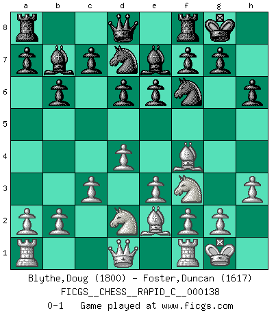 Last move : 0-1 2017 May 31 19:27:2 [Event "FICGS__CHESS__RAPID_C__000138"] [Site "FICGS"] [Date "2017.03.28"] [Round "1"] [White "Blythe,Doug"] [Black "Foster,Duncan"] [Result "0-1"] [WhiteElo "1800"] [BlackElo "1617"] 1.d4 b6 2.Bf4 Bb7 3.e3 e6 4.Nf3 h6 5.h3 Nf6 6.Be2 d6 7.O-O Be7 8.Nbd2 O-O 9.c3 Nbd7 0-1 This chess game has been lost on time (started : 2017.03.28 15:22:28) Queen's pawn : English defense Kingside Castling by player White (move 7) Kingside Castling by player Black (move 8) Player Black won this chess game. Follow this game move after move (download)Nothing excites jaded Grandmasters more than a theoretical novelty. (Dominic Lawson) Wer wird heute Abend ihr Gegner sein? -- Heute Abend spiele ich gegen die schwarzen Steine. (Akiba Rubinstein) Aquel que ve no otra dirección en el juego que la de dar Jaque Mate a su oponente, nunca será un buen jugador de Ajedrez. (Euwe) Le pion, dans sa simplicité, marche droit devant lui, mais lorsqu'il prend, il le fait obliquement? Ainsi l'homme, tant qu'il reste pauvre, marche dans la droiture et vit honnêtement, mais lorsqu'il recherche les honneurs, il flatte, se parjure et, par les voies obliques, cherche une position supérieure sur l'échiquier du monde. (Jean de Galles) The message for business people contemplating their place in the cyberspace is simple and direct: get linked or get lost. (Vic Sussman and Kenan Pollack)