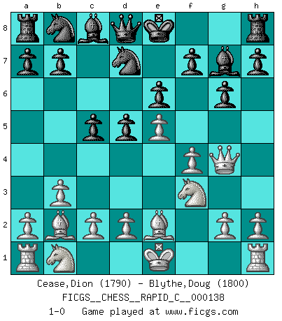 Last move : 1-0 2017 June 1 7:46:8 [Event "FICGS__CHESS__RAPID_C__000138"] [Site "FICGS"] [Date "2017.03.28"] [Round "1"] [White "Cease,Dion"] [Black "Blythe,Doug"] [Result "1-0"] [WhiteElo "1790"] [BlackElo "1800"] 1.e4 e6 2.b3 d5 3.Bb2 Nf6 4.e5 Nfd7 5.Qg4 g6 6.f4 Bg7 7.Nf3 c5 8.Be2 1-0 This chess game has been lost on time (started : 2017.03.28 15:22:28) French : Reti (Spielmann) variation Player White won this chess game. Follow this game move after move (download)It is no time to be playing Chess when the house is on fire. (Italian Proverb) Charakterschwächen offenbaren sich normalerweise während einer Schachpartie. (Garry Kasparov) Las combinaciones han sido siempre el aspecto más intrigante del Ajedrez. Los Maestros las buscan, el público las aplauden, los críticos las alaban. La razón se debe a que las combinaciones hacen posible que el Ajedrez sea más que un ejercicio matemático con una carencia de vida. Ellas son la poesía del juego, son del Ajedrez lo que la melodía es de la música. Ellas representan el triunfo de la mente sobre la materia. (Reuben Fine) Donnez-moi un Cavalier en 6e et je gagnerais toutes mes parties. (Steinitz) Luck never gives; it only lends. (Swedish proverb)