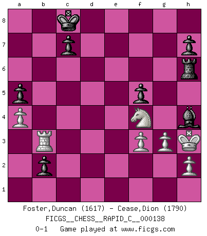 Last move : 0-1 2017 August 22 16:35:46 [Event "FICGS__CHESS__RAPID_C__000138"] [Site "FICGS"] [Date "2017.03.28"] [Round "1"] [White "Foster,Duncan"] [Black "Cease,Dion"] [Result "0-1"] [WhiteElo "1617"] [BlackElo "1790"] 1.e4 e5 2.Nf3 Nc6 3.d4 exd4 4.Nxd4 Nf6 5.Nxc6 bxc6 6.e5 Qe7 7.Qe2 Nd5 8.c4 Nb6 9.Nc3 Ba6 10.Qe4 f6 11.exf6 Qxe4+ 12.Nxe4 gxf6 13.b3 O-O-O 14.f3 d5 15.cxd5 Bxf1 16.Kxf1 f5 17.Ng3 Bg7 18.Rb1 Rxd5 19.Be3 Rf8 20.Nh5 Bc3 21.Kf2 Re8 22.Bf4 Bd4+ 23.Kg3 Re2 24.a4 Rd8 25.Kh3 Nd5 26.Rhe1 Ra2 27.Bg3 Ne3 28.Nf4 Rd6 29.Re2 Rh6+ 30.Bh4 Ra3 31.g3 c5 32.Rd2 a5 33.Ne2 Bf6 34.Nf4 c4 35.Re2 Rxb3 36.Rxb3 cxb3 37.Rxe3 b2 38.Rb3 Bxh4 0-1 Scotch : Mieses variation Queenside Castling by player Black (move 13) Player Black won this chess game. Follow this game move after move (download)There are two types of sacrifices: correct ones and mine. (Mikhail Tal) Wenn Du einsam bist, wenn Du Dich in der Welt wie ein Fremder fühlst, spiele Schach. Das wird Deinen Geist erheben und Dein Ratgeber im Kampf sein. (Aristoteles) La enorme capacidad mental, en la que sin ella no puede un jugador de Ajedrez existir, es demasiado requerida por el Ajedrez al grado de que nunca podrá liberar su mente de este juego. (Albert Einstein) Les échecs sont plus proches de l'art de l'assassinat que de l'art de la guerre. (Arturo Perez-Reverte) Dave, my mind is going. I can feel it. (HAL 9000 in 2001, a space odyssey)