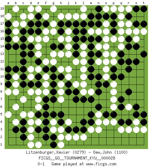 Last move : 0-1 2007 May 20 21:23:27 [Event "FICGS__GO__TOURNAMENT_KYU__000028"] [Site "FICGS"] [Date "2007.04.05"] [Round "1"] [Black "Litzenburger,Xavier"] [White "Dew,John"] [Result "0-1"] [Rating 1 "0279"] [Rating 2 "1100"] 1.d16 d4 2.q4 r16 3.p17 q15 4.m17 r6 5.r8 r3 6.r4 q3 7.q6 s4 8.s5 s3 9.s6 p4 10.r11 q17 11.j17 c14 12.f17 b16 13.c12 c17 14.c9 c7 15.f3 d2 16.k3 m3 17.h4 h2 18.f2 k2 19.l3 l2 20.m4 n3 21.k10 n5 22.r14 s13 23.s14 r13 24.q13 q14 25.r12 p13 26.q12 s15 27.s12 o15 28.e5 d5 29.m5 p6 30.q7 p7 31.m7 g4 32.f4 g3 33.g5 j4 34.j3 h3 35.h5 j2 36.l4 e6 37.f6 e7 38.e9 e14 39.f7 f12 40.d13 f15 41.d14 d15 42.c15 e15 43.c16 b15 44.d17 c18 45.b14 g17 46.g18 h18 47.h17 e17 48.e18 d18 49.e16 f16 50.e17 g16 51.c13 j15 52.k16 j16 53.l17 j11 54.k14 j14 55.k13 j13 56.g14 e13 57.h12 h11 58.j12 k12 59.k11 l12 60.k15 g13 61.h16 h15 62.c3 d3 63.b5 b6 64.c2 b4 65.n13 p8 66.h14 h13 67.g11 g12 68.g10 h9 69.h10 j10 70.j9 k9 71.j8 l9 72.p18 q18 73.n15 f10 74.g9 h8 75.k8 l8 76.l7 f9 77.g8 h7 78.k7 f8 79.g7 d11 80.c11 d10 81.a17 a18 82.b18 b19 83.a19 b17 84.c19 d19 85.a15 b19 86.a16 a18 87.a14 j18 88.k17 g19 89.p16 p15 90.t13 p12 91.m11 l11 92.m10 l10 93.p10 k18 94.r15 q16 95.s17 n14 96.m14 o14 97.m12 s16 98.r18 p19 99.o18 o13 100.s19 t18 101.q19 r19 102.c4 c5 103.q19 s18 104.t17 r19 105.b3 a5 106.q19 t16 107.t19 r19 108.p5 q19 109.o5 b10 110.c10 b9 111.b11 b8 112.e10 e11 113.d9 d1 114.f11 n16 115.m15 n18 116.n17 n4 117.n6 o10 118.o9 p9 119.n10 o11 120.q10 o4 121.n9 m8 122.n8 l13 123.m13 e8 124.e12 e4 125.f5 o16 126.n19 o19 127.m18 o17 128.n18 m16 129.l16 l14 130.l15 f18 131.p11 e19 132.c14 l19 133.o12 n12 134.g1 h1 135.t4 o12 136.a10 d8 137.a9 a8 138.a11 t3 139.t5 l18 140.g2 e1 141.e3 r17 0-1 Here are the names of the openings (joseki) played in the four corners : Corner q16 : r16 p17 Komoku (Somok, Xiao~mu`) 3-4 Point. The komoku (3-4) point is the traditional corner enclosure move.. Ikken Kakari (Hankan Keolch'im, Yi Gua`jiao~, 1-Space Low Pincer). The small knight move is the basic approach move to the 3-4 point stone. It has been continually used for over four centuries. There are limitless variations, with new moves constantly being discovered. Black 2 opens the door to a treaure store of joseki. Corner q4 : q4 r6 Hoshi (Hwajeom, Seongjeom, Xingwei`) 4-4 Point. The star or hoshi (4-4) point, emphasizing influence at the potential expense of territory. Ikken Kakari (Hankan Keolch'im, Yi Gua`jiao~, 1-Space Low Approach). White 2 is the standard approach move to the 4-4. Corner d4 : d4 c9 Hoshi (Hwajeom, Seongjeom, Xingwei`) 4-4 Point. The star or hoshi (4-4) point, emphasizing influence at the potential expense of territory. Player White won this Go (weiqi, baduk) game. Follow this game move after move (download)If you have lost four corners, resign. (Anonymous) You can't play chess if you're groggy from pills. (Anatoly Karpov)