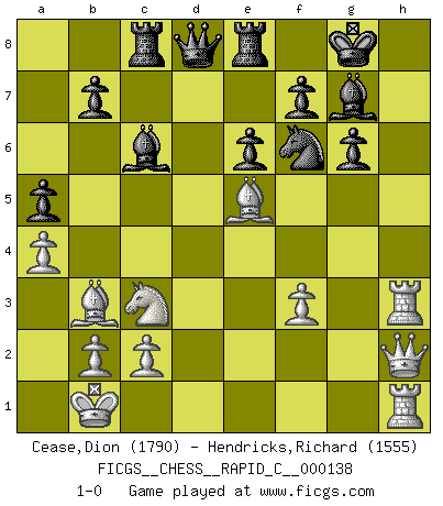 Last move : 1-0 2017 June 18 17:27:58 [Event "FICGS__CHESS__RAPID_C__000138"] [Site "FICGS"] [Date "2017.03.28"] [Round "1"] [White "Cease,Dion"] [Black "Hendricks,Richard"] [Result "1-0"] [WhiteElo "1790"] [BlackElo "1555"] 1.e4 c5 2.Nf3 Nc6 3.d4 cxd4 4.Nxd4 g6 5.Nc3 Bg7 6.Be3 Nf6 7.Bc4 O-O 8.Bb3 d6 9.f3 Bd7 10.h4 a5 11.a4 e6 12.Qd2 d5 13.O-O-O dxe4 14.h5 Nxd4 15.Bxd4 Bc6 16.hxg6 hxg6 17.Qe3 exf3 18.gxf3 Re8 19.Kb1 Qe7 20.Bc5 Qc7 21.Bd6 Qd8 22.Qf4 Rc8 23.Be5 Qe7 24.Rd2 Red8 25.Rdh2 Re8 26.Rh3 Qd8 27.Qh2 1-0 Sicilian : Accelerated Fianchetto, Modern variation with Bc4 Kingside Castling by player Black (move 7) Queenside Castling by player White (move 13) Player White won this chess game. Follow this game move after move (download)A Chess game is a dialogue, a conversation between a player and his opponent. Each move by the opponent may contain threats or be a blunder, but a player cannot defend against threats or take advantage of blunders if he does not first ask himself: What is my opponent planning after each move ? (Bruce A. Moon) Mein Gehirn das ist mein zweitwichtigstes Organ [Aus dem Film: Der Schläfer]. (Woody Allen) Cada Peón es potencialmente una Reina. (James Mason) Le succès, c'est être capable d'aller d'échec en échec sans perdre son enthousiasme. (Winston Churchill) A married woman is like a fish riding a bicycle. (Rodolfo d'Ettorre)