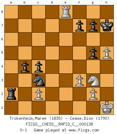 Last move : 0-1 2017 July 13 18:54:56 [Event "FICGS__CHESS__RAPID_C__000138"] [Site "FICGS"] [Date "2017.03.28"] [Round "1"] [White "Trokenheim,Marek"] [Black "Cease,Dion"] [Result "0-1"] [WhiteElo "1835"] [BlackElo "1790"] 1.b4 e5 2.Bb2 Bxb4 3.Bxe5 Nf6 4.Nc3 c6 5.Rb1 a5 6.e3 d5 7.h3 Nbd7 8.Bh2 Bxc3 9.dxc3 Ne4 10.Ne2 O-O 11.f3 Nec5 12.Kf2 b5 13.Bf4 Re8 14.Nd4 Qf6 15.Kg1 Na4 16.Qe1 Ndb6 17.h4 Bd7 18.Bg5 Qd6 19.h5 h6 20.Bf4 Qe7 21.Bd3 b4 22.Qg3 Kh8 23.cxb4 axb4 24.e4 c5 25.Bd6 Qg5 26.Qxg5 hxg5 27.Ne2 dxe4 28.Bxe4 Ra6 29.Ng3 Nc4 30.Bd3 Rxd6 31.Bxc4 Nc3 32.Ra1 Kg8 33.Kh2 Rd4 34.Bd3 c4 35.Bf5 Bxf5 36.Nxf5 Rf4 37.Ng3 Rh4+ 38.Kg1 Rxh1+ 39.Kxh1 Ra8 40.Re1 Rxa2 41.Re8+ Kh7 0-1 Polish (Sokolsky) opening Kingside Castling by player Black (move 10) Player Black won this chess game. Follow this game move after move (download)Chess opens and enriches your mind. (Saudin Robovic) Ich hatte Angst gegen einen russischen Großmeister zu verlieren, und er befürchtete gegen einen kleinen Jungen zu verlieren. (über ein Remis gegen Juri Awerbach). (Robert James Fischer) El juego del Ajedrez no es solamente una diversión quieta; algunas cualidades muy valuables de la mente se pueden adquirir y cultivar con el, como convertirlos en habitos disponibles para toda ocasión; ya que la vida es algo así como el Ajedrez. (Benjamin Franklin) C'est une question de caractère, Beaucoup de gens perdent leur motivation très vite. D'autres, ils sont rares, peuvent la conserver très longtemps. J'aime les échecs, encore aujourd'hui je suis heureux d'analyser des parties. J'aime toujours gagner, je déteste encore perdre. Bien jouer est important pour mon intégrité intellectuelle et morale. Et puis les échecs vivent en ce moment une période historique grâce à Internet. Ils se développent dans les systèmes éducatifs à travers le monde. Ils sortent de leur ghetto, et c'est mon rôle de mener à bien cette révolution. (Gary Kasparov) Perception is reality. (Immanuel Kant)