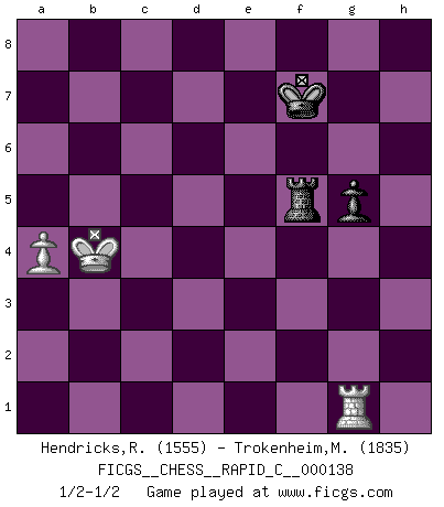 Last move : 1/2-1/2 2017 May 17 16:25:28 [Event "FICGS__CHESS__RAPID_C__000138"] [Site "FICGS"] [Date "2017.03.28"] [Round "1"] [White "Hendricks,Richard"] [Black "Trokenheim,Marek"] [Result "1/2-1/2"] [WhiteElo "1555"] [BlackElo "1835"] 1.d4 d5 2.Nf3 Nf6 3.c4 e6 4.Nc3 Be7 5.Bf4 O-O 6.e3 Nbd7 7.Qc2 c6 8.h3 a6 9.cxd5 Nxd5 10.Nxd5 exd5 11.Bd3 Bb4+ 12.Nd2 Nf6 13.O-O Bd6 14.Rfe1 Re8 15.Nf3 Ne4 16.Rad1 Bf5 17.Ne5 f6 18.f3 fxe5 19.dxe5 Bxe5 20.fxe4 Bxf4 21.exf4 Qb6+ 22.Qf2 Qxf2+ 23.Kxf2 dxe4 24.Bc4+ Kf8 25.g4 b5 26.Bb3 Be6 27.Bxe6 Rxe6 28.f5 R6e8 29.Rd7 Rad8 30.Red1 Rxd7 31.Rxd7 e3+ 32.Ke2 h5 33.Rc7 hxg4 34.hxg4 Re4 35.g5 Rb4 36.b3 Rf4 37.Rxc6 Rxf5 38.Rxa6 Rxg5 39.Kxe3 Ke7 40.Kd4 Rg4+ 41.Kc5 Rg5+ 42.Kb4 Rf5 43.Rg6 Kf7 44.Rg1 g5 45.a4 bxa4 46.bxa4 1/2-1/2 Comment by player 2 : Marek Trokenheim : DRAW! Queen's pawn game Kingside Castling by player Black (move 5) Kingside Castling by player White (move 13) 10 pieces endgame at move 38 : White KRPPP , Black KRPPP WHITE : King + 1 Rook 3 Pawns BLACK : King + 1 Rook 3 Pawns 9 pieces endgame at move 38 : White KRPP , Black KRPPP WHITE : King + 1 Rook 2 Pawns BLACK : King + 1 Rook 3 Pawns 8 pieces endgame at move 39 : White KRPP , Black KRPP WHITE : King + 1 Rook 2 Pawns BLACK : King + 1 Rook 2 Pawns 7 pieces endgame at move 45 : White KRP , Black KRPP WHITE : King + 1 Rook 1 Pawn BLACK : King + 1 Rook 2 Pawns 6 pieces endgame at move 46 : White KRP , Black KRP WHITE : King + 1 Rook 1 Pawn BLACK : King + 1 Rook 1 Pawn This chess game ended in a draw. Follow this game move after move (download)Morphy was probably the greatest genius of them all. (Bobby Fischer) Mit sehr nachdenklichem Gesicht schreitet Bobby durch den Turniersaal. Was ist passiert?, fragt Lombardy. Ich stehe schlecht, antwortet Fischer. Lombardy: Dann biete doch einfach Remis an. Fischer: So schlecht stehe ich nun auch wieder nicht! (Robert James Fischer) Cuando le juegas a Fischer, no es una cuestion de si vas a ganar o perder. Es una cuestion de si vas a sobrevivir. (Boris Spassky) Tous ces prétendus hommes politiques sont les pions, les Cavaliers, les Tours ou les Fous d'une partie d'échecs qui se jouera tant qu'un hasard ne renversera pas l'échiquier. (Honoré de Balzac) Before all elsed, be armed. (Niccolo Machiavelli)
