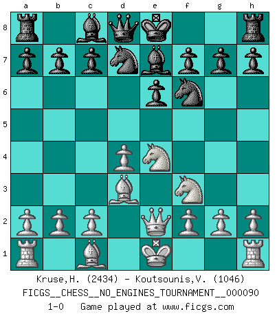 Last move : 1-0 2017 May 11 15:35:10 [Event "FICGS__CHESS__NO_ENGINES_TOURNAMENT__000090"] [Site "FICGS"] [Date "2017.04.01"] [Round "1"] [White "Kruse,Herbert"] [Black "Koutsounis,Vassilios"] [Result "1-0"] [WhiteElo "2434"] [BlackElo "1046"] 1.e4 e6 2.d4 d5 3.Nc3 dxe4 4.Nxe4 Nd7 5.Nf3 Be7 6.Bd3 Ngf6 7.Qe2 1-0 This chess game has been lost on time (started : 2017.04.01 12:53:35) French : Rubinstein variation Player White won this chess game. Follow this game move after move (download)Chess is a terrific way for kids to build self image and self esteem. (Saudin Robovic) Ohne Leiden bildet sich kein Charakter. (Ernst Freiherr von Feuchtersleben) Todavía soy una víctima del Ajedrez. Tiene toda la belleza del arte y mucho mas. No puede ser comercializado. El Ajedrez es mas puro que el arte en su posición social. (Marcel Duchamp) Aux échecs, les retours au sommet sont rares : les dommages psychologiques consécutifs à une défaite sont trop sévères. (Daily Telegraph) Home computers are being called upon to perform many new functions, including the consumption of homework formerly eaten by the dog. (Doug Larson)