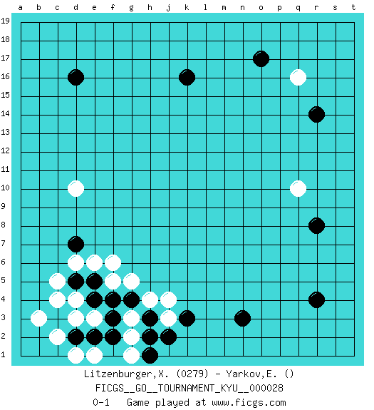 Last move : 0-1 2007 July 19 23:44:9 [Event "FICGS__GO__TOURNAMENT_KYU__000028"] [Site "FICGS"] [Date "2007.04.05"] [Round "1"] [Black "Litzenburger,Xavier"] [White "Yarkov,Evgeny"] [Result "0-1"] [Rating 1 "0279"] 1.d16 d4 2.r4 q16 3.f3 e3 4.f4 d10 5.k3 f5 6.c3 c4 7.e2 d3 8.d2 q10 9.d7 c2 10.e5 b3 11.e4 f6 12.r14 g3 13.g4 g2 14.f2 h4 15.h3 j3 16.h2 g1 17.j2 j4 18.n3 g5 19.k16 e6 20.d5 d6 21.o17 c5 22.r8 e1 23.h1 d1 0-1 This go game has been lost on time (started : 2007.04.05 3:15:26) Here are the names of the openings (joseki) played in the four corners : Corner d4 : d4 f3 Hoshi (Hwajeom, Seongjeom, Xingwei`) 4-4 Point. The star or hoshi (4-4) point, emphasizing influence at the potential expense of territory. Ikken Kakari (Hankan Keolch'im, Yi Gua`jiao~, 1-Space Low Approach). Black 2 is the standard approach move to the 4-4. Corner q16 : q16 r14 Hoshi (Hwajeom, Seongjeom, Xingwei`) 4-4 Point. The star or hoshi (4-4) point, emphasizing influence at the potential expense of territory. Ikken Kakari (Hankan Keolch'im, Yi Gua`jiao~, 1-Space Low Approach). Black 2 is the standard approach move to the 4-4. Player White won this Go (weiqi, baduk) game. Follow this game move after move (download)A meijin needs no joseki. (Anonymous) No man has ever achieved immortality in his own life time. (Unknown)
