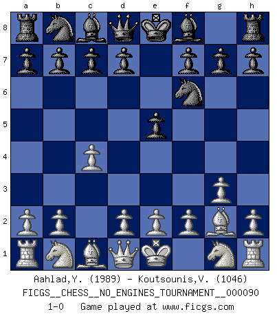 Last move : 1-0 2017 May 13 3:38:20 [Event "FICGS__CHESS__NO_ENGINES_TOURNAMENT__000090"] [Site "FICGS"] [Date "2017.04.01"] [Round "1"] [White "Aahlad,Yeturu"] [Black "Koutsounis,Vassilios"] [Result "1-0"] [WhiteElo "1989"] [BlackElo "1046"] 1.c4 e5 2.g3 Nf6 3.Bg2 1-0 This chess game has been lost on time (started : 2017.04.01 12:53:35) English Opening Player White won this chess game. Follow this game move after move (download)When I asked Fischer why he had not played a certain move in our game, he replied: 'Well, you laughed when I wrote it down !' (Mikhail Tal) Wer sich die Fähigkeit anerziehen will im Schach selbstständig zu denken, der muß alles meiden, was leblos ist: ausgeklügelte Theorien, die sich auf sehr wenige Beispiele und eine Menge Hirngespinste stützen. (Emanuel Lasker) Bobby es la celebridad menos entendida y malinterpretada que camina el la faz de esta tierra. (Yasser Seirawan) La menace est plus forte que l'exécution. (Aaron Nimzovitch) I don't diet. I just don't eat as much as I'd like to. (Linda Evangelista, supermodel)
