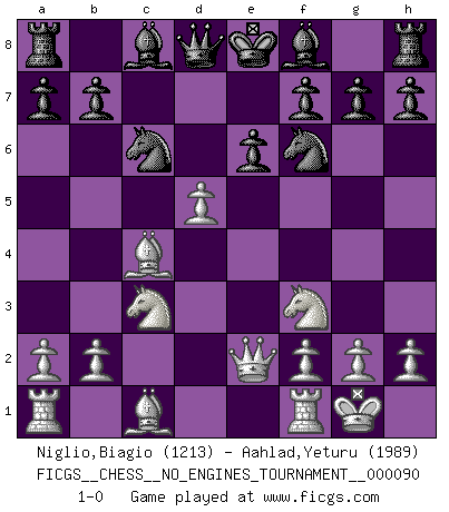 Last move : 1-0 2017 April 12 21:33:5 [Event "FICGS__CHESS__NO_ENGINES_TOURNAMENT__000090"] [Site "FICGS"] [Date "2017.04.01"] [Round "1"] [White "Niglio,Biagio"] [Black "Aahlad,Yeturu"] [Result "1-0"] [WhiteElo "1213"] [BlackElo "1989"] 1.e4 c5 2.d4 cxd4 3.c3 dxc3 4.Nxc3 Nc6 5.Nf3 e6 6.Bc4 Nf6 7.O-O d6 8.Qe2 d5 9.exd5 1-0 Sicilian : Smith-Morra gambit Kingside Castling by player White (move 7) Player White won this chess game. Follow this game move after move (download)One of these modest little moves may be more embarrassing to your opponent than the biggest threat. (Siegbert Tarrasch) Wenn ich einen Club besuche, sind die Spieler stumm vor Staunen. (José Raúl Capablanca) Cuando le juegas a Fischer, no es una cuestion de si vas a ganar o perder. Es una cuestion de si vas a sobrevivir. (Boris Spassky) On a dit que l'homme se distingue de l'animal par le fait qu'il achète plus de livres qu'il ne peut en lire. Je voudrais suggérer qu'inclure à la liste des livres quelques livres d'échecs rendrait la distinction manifeste. (Edward Lasker) Think like a man of action, act like a man of thought. (Henri Louis Bergson)