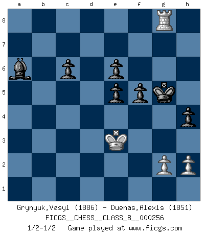 Last move : 1/2-1/2 2017 April 2 21:52:17 [Event "FICGS__CHESS__CLASS_B__000256"] [Site "FICGS"] [Date "2017.04.02"] [Round "1"] [White "Grynyuk,Vasyl"] [Black "Duenas,Alexis"] [Result "1/2-1/2"] [WhiteElo "1886"] [BlackElo "1851"] 1.e4 c5 2.Nf3 d6 3.d4 cxd4 4.Nxd4 Nf6 5.Nc3 a6 6.Bg5 e6 7.f4 Qb6 8.Qd2 Qxb2 9.Rb1 Qa3 10.f5 Nc6 11.fxe6 fxe6 12.Nxc6 bxc6 13.e5 dxe5 14.Bxf6 gxf6 15.Ne4 Be7 16.Be2 h5 17.Rb3 Qa4 18.c4 f5 19.Nd6+ Bxd6 20.Qxd6 Qa5+ 21.Kf2 Ra7 22.c5 Qc7 23.Rd1 Kf7 24.Rb8 Kf6 25.Bxa6 Qxd6 26.cxd6 Rxa6 27.d7 Rxa2+ 28.Ke1 Re2+ 29.Kxe2 Ba6+ 30.Ke3 Rxb8 31.d8Q+ Rxd8 32.Rxd8 h4 33.Rh8 Kg5 34.Rg8+ Kf6 35.Rh8 Kg5 36.Rg8+ 1/2-1/2 Sicilian : Najdorf, 7...Qb6 Promotion Queen by player White (move 31) This chess game ended in a draw. Follow this game move after move (download)Capture of the adverse King is the ultimate but not the first object of the game. (William Steinitz) Nur ein wirklich starker Spieler weiß wie schwach er spielt. (Savielly Grigorievitsch Tartakower) Hay dos clases de hombres: aquellos que se conforman en dejarse llevar por las circunstancias y que juegan barajas y aquellos decididos a controlar las circunstancias y que juegan al Ajedrez. (Mortimer Collins) Les Echecs sont affaire de jugement sensible. Savoir quand frapper et quand esquiver. (Fischer) Somehow our devils are never quite what we expect when we meet them face to face. (Nelson DeMille)